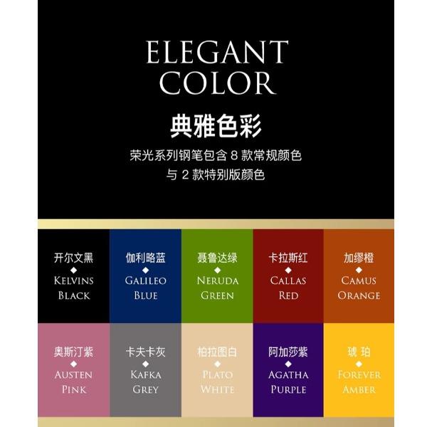 型号:荣光系列墨水笔 类型:螺纹上上墨式墨水笔 重量:墨水/宝珠笔43g/47g 颜色分类:开尔文黑/卡拉斯红/奥斯汀紫/加缪橙/伽利略蓝/卡夫卡灰/柏拉图白 书写粗细:F尖 套餐类型:官方标配 包装方式:鸿运笔记本礼盒装 适用场景:送礼书写 钢笔笔尖成分:铱金笔 笔尖种类;标准型 适用人群:商务办公人士 上墨方式:旋转吸墨 笔杆材质:金属 笔尖嵌入方式:明尖 笔身纹理:格子纹 墨水材质:非碳素墨水