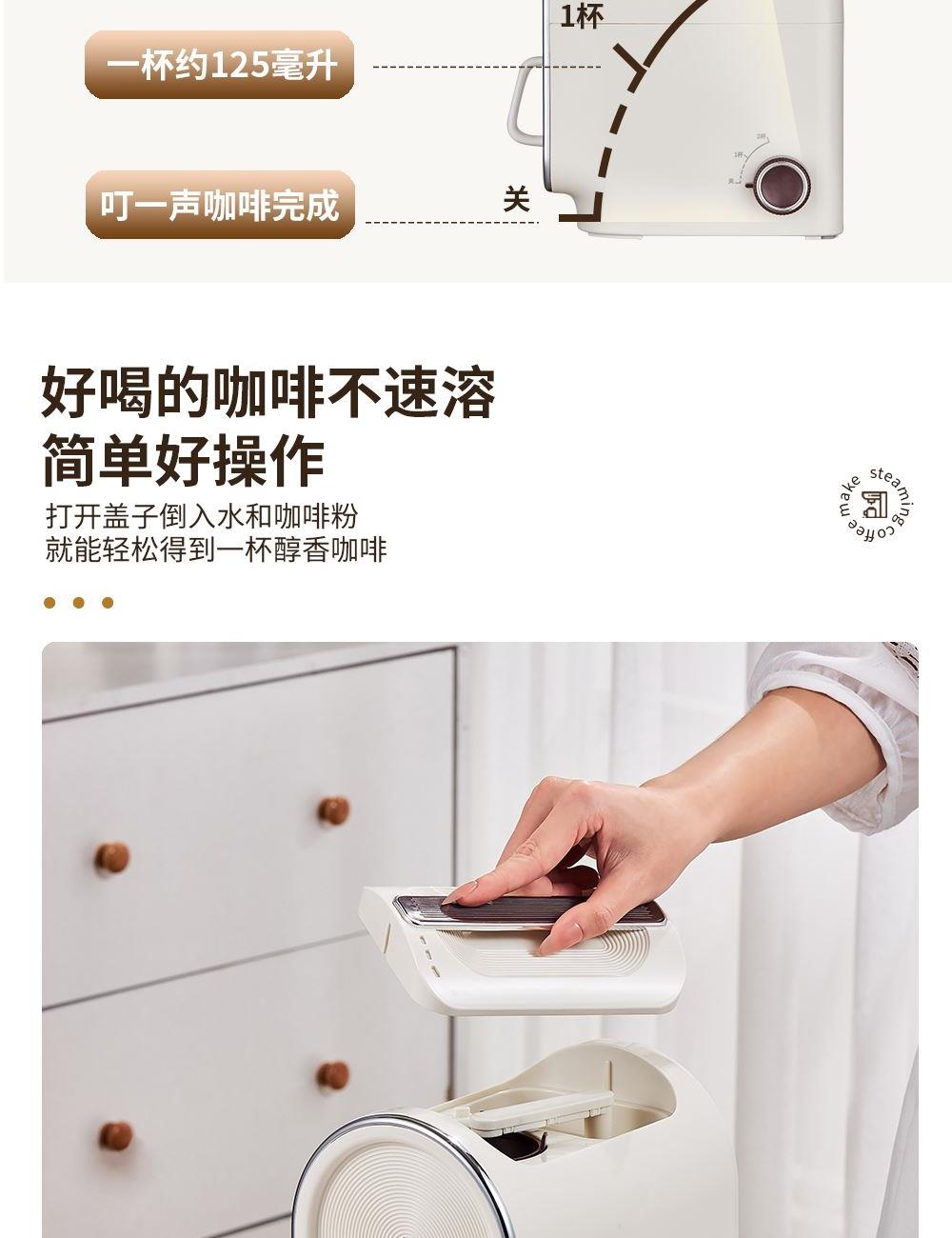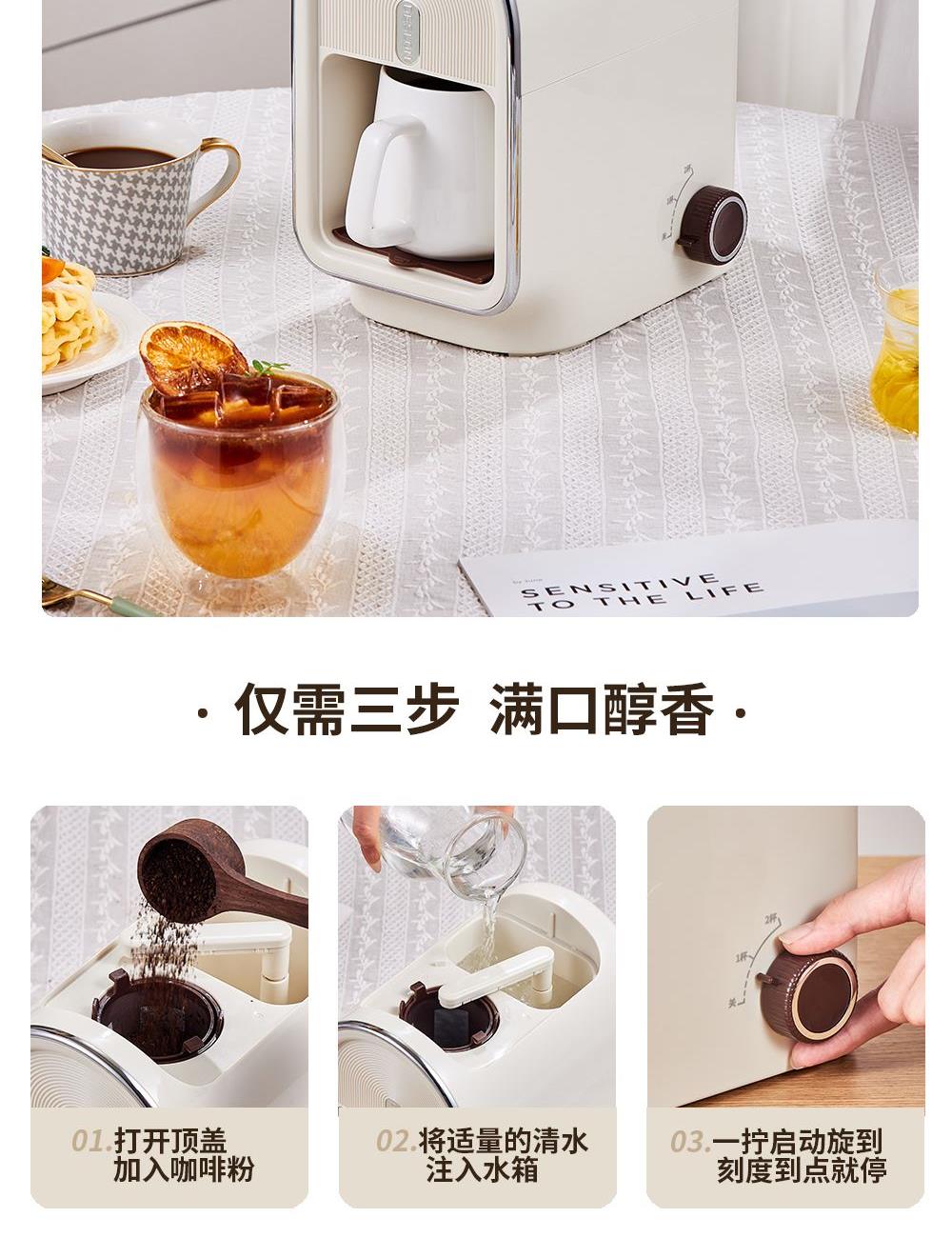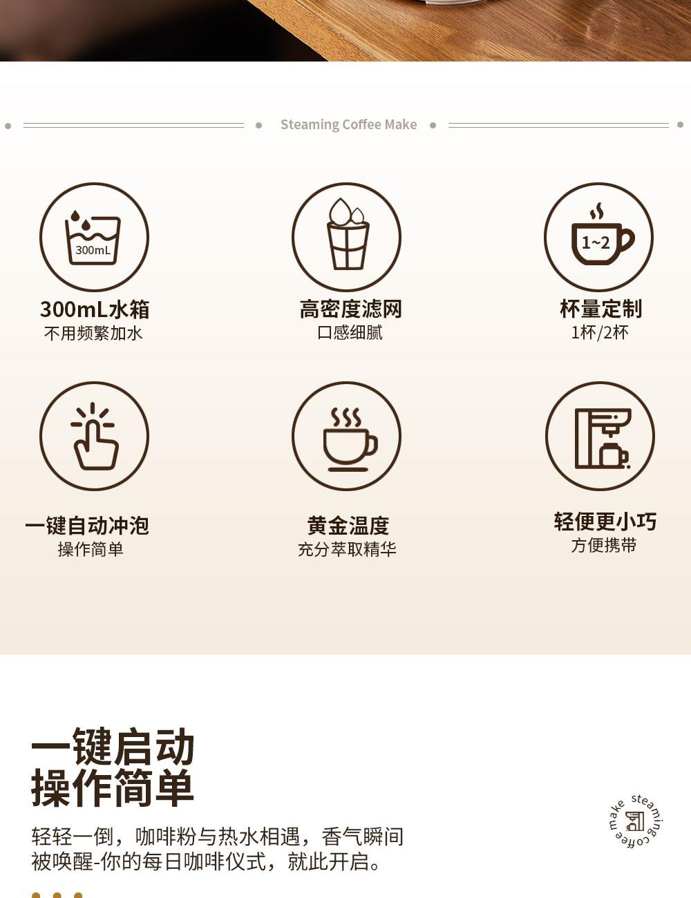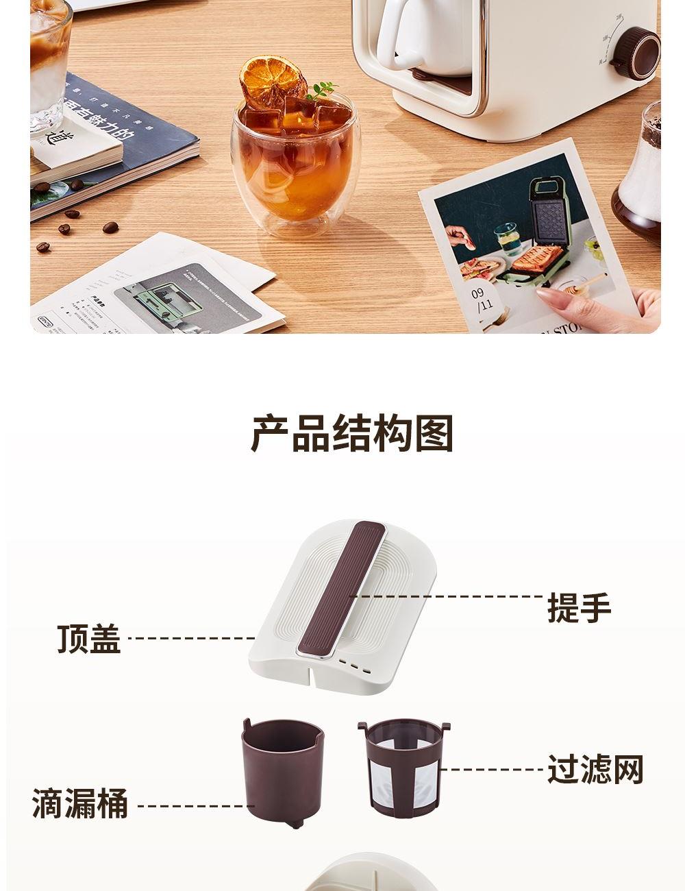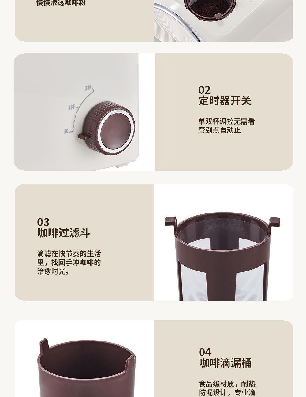 额定电压:220V~ 额定频率:50Hz 额定功率:400W 水箱容量:300mL 控制方式:机械式定时器控制 主要材质:ABS+PP 1、时尚外形设计,欧式轻复古风格,外观时尚; 2、即热式锅炉加热系统,模拟手冲咖啡方式; 3、采用定时器控制,自动出量,简单方便; 4、分体式上盖,加水、加粉、清洗等轻松操作; 5、内置安全保护装置,保障特殊情况安全。