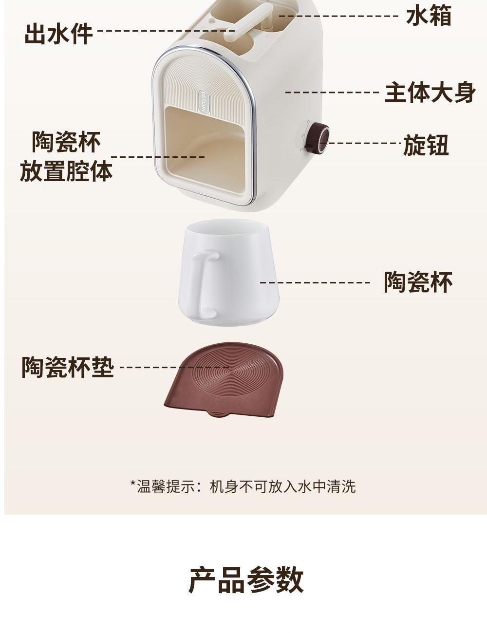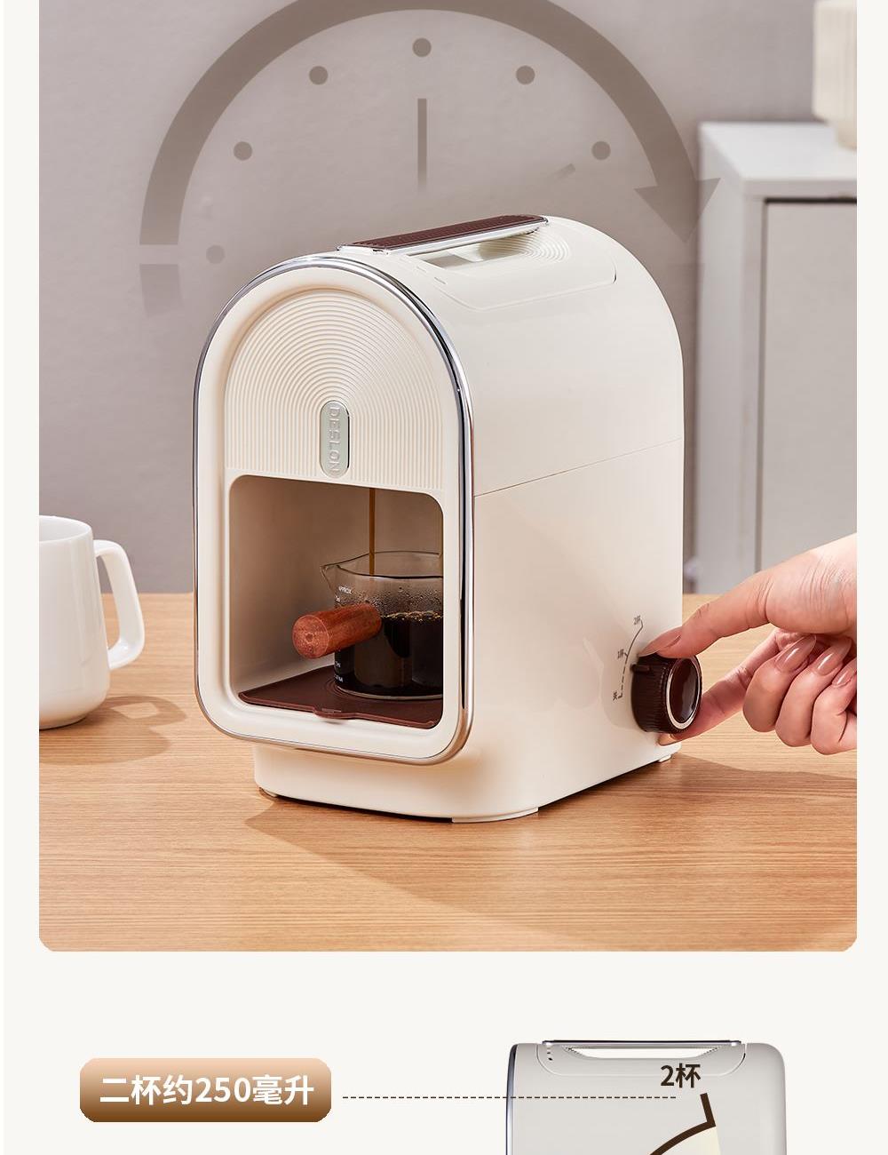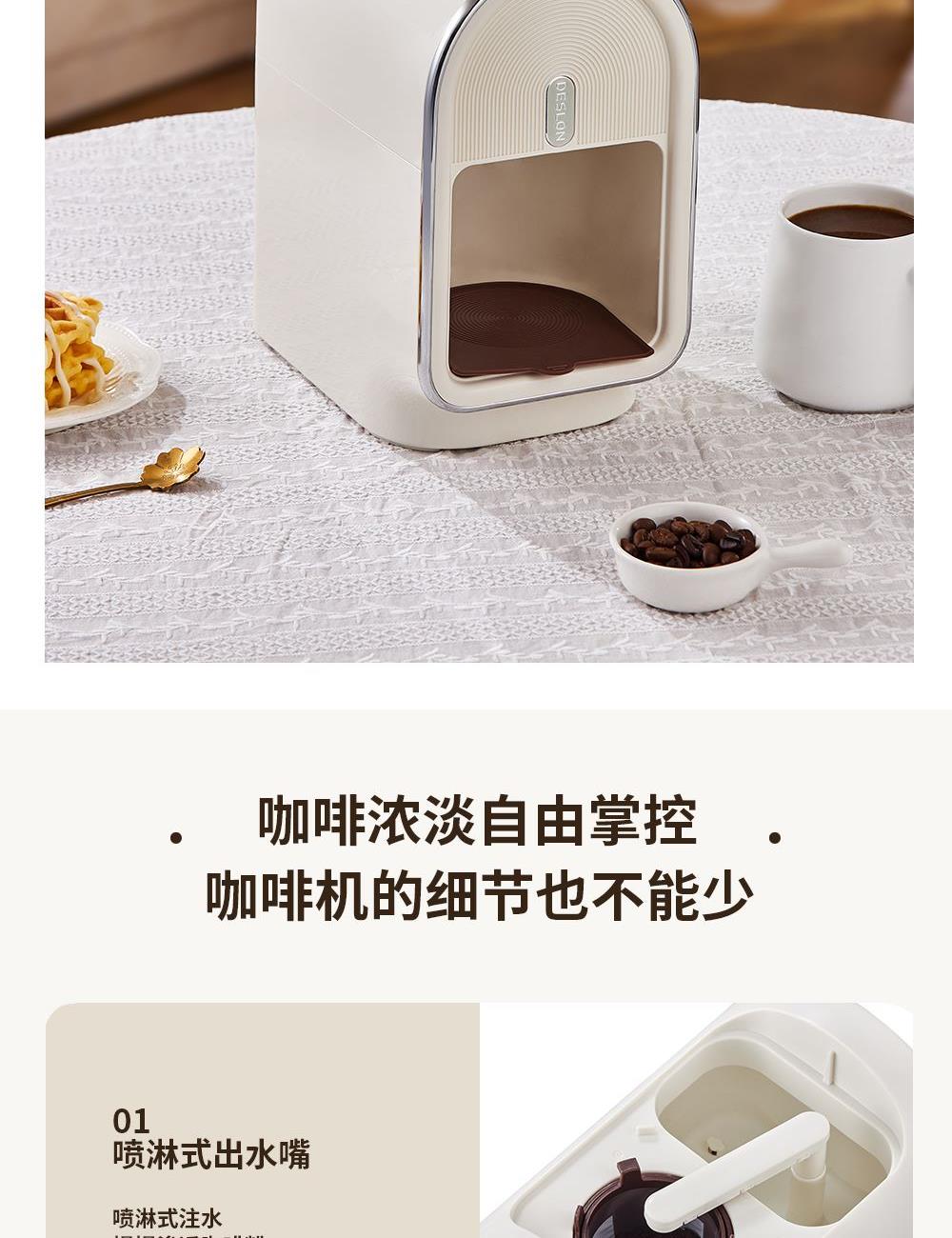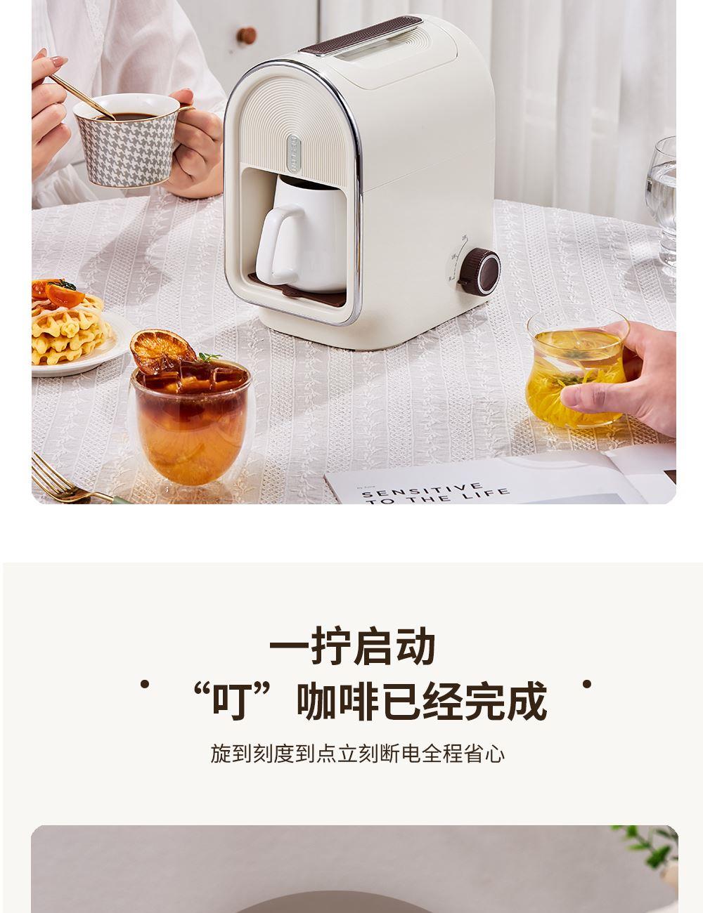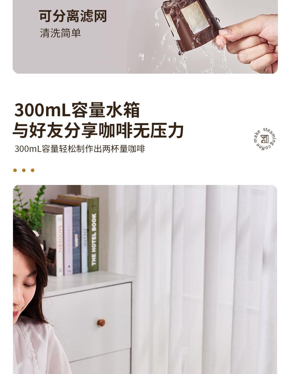 额定电压:220V~ 额定频率:50Hz 额定功率:400W 水箱容量:300mL 控制方式:机械式定时器控制 主要材质:ABS+PP 1、时尚外形设计,欧式轻复古风格,外观时尚; 2、即热式锅炉加热系统,模拟手冲咖啡方式; 3、采用定时器控制,自动出量,简单方便; 4、分体式上盖,加水、加粉、清洗等轻松操作; 5、内置安全保护装置,保障特殊情况安全。