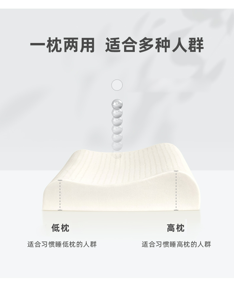 规格:40*60cm 面料:针织棉+网纱 填充:泰国进口乳胶 执行标准:GB/T22843-2009 安全类别:GB18401-2010 B类 1.乳胶是一种天然材质,其原液是直接从橡胶树皮中滴落下来的乳胶汁物理发泡加工一次成型,有天然乳香气息,含量高达90%以上乳胶成分,多纬蜂窝状气孔,较其他枕芯更为舒适,快速散发人体睡眠中余热和湿气。 2.枕头高弹力,贴合人体脊椎生长曲度,仰睡侧睡都可以,给您更好的承托力