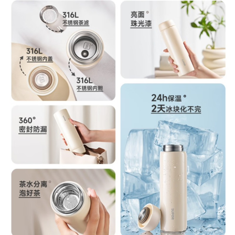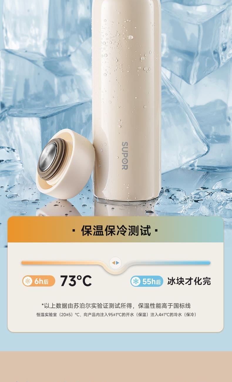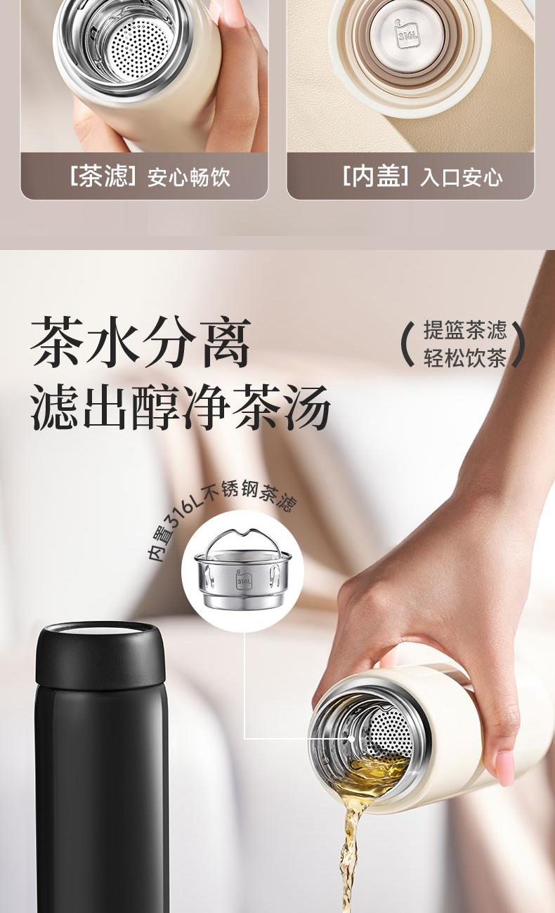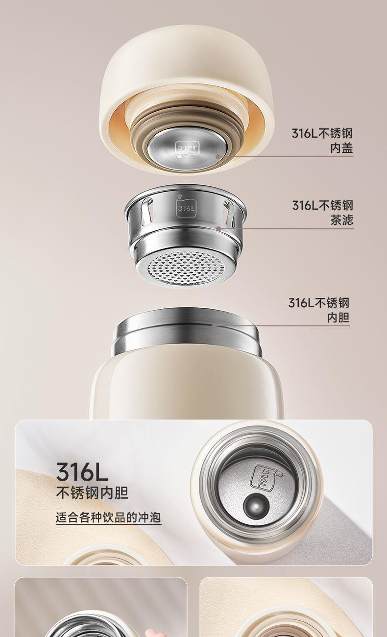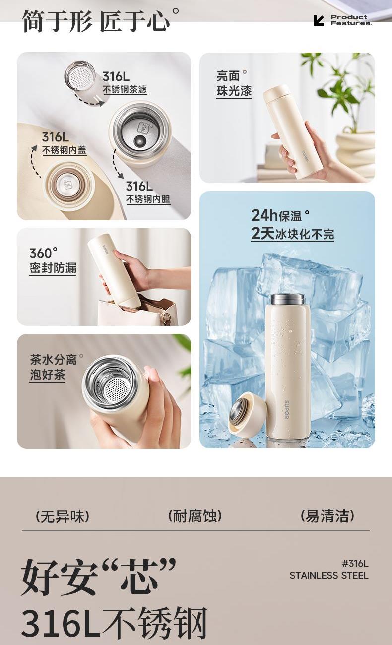 规格参数 产品说明 容量:450ml 材质:316L 功能卖点 1、316L不锈钢内胆,饮水(钢)好• 不锈钢,安全可靠,适 合各种饮品的冲泡 2、杯盖内置硅胶密封圈,密封防 撒漏 3、精巧小直径,入包随行无压力 4、2天冰块还不化*炎夏冰饮供应机,畅快度夏