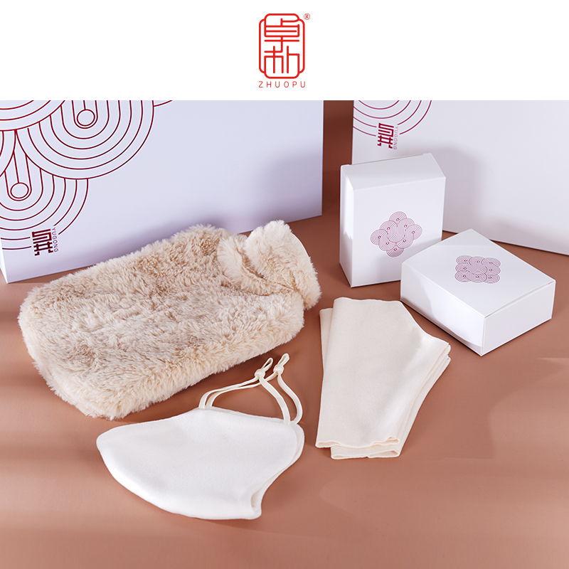 配置:毛绒暖水袋+德绒手套+椰绒口罩 材质:仿兔毛+德绒+椰绒 尺寸:热水袋:1000ml 手套:190*115mm 口罩:240*140mm 包装:礼盒(298*262*100mm)+手提袋