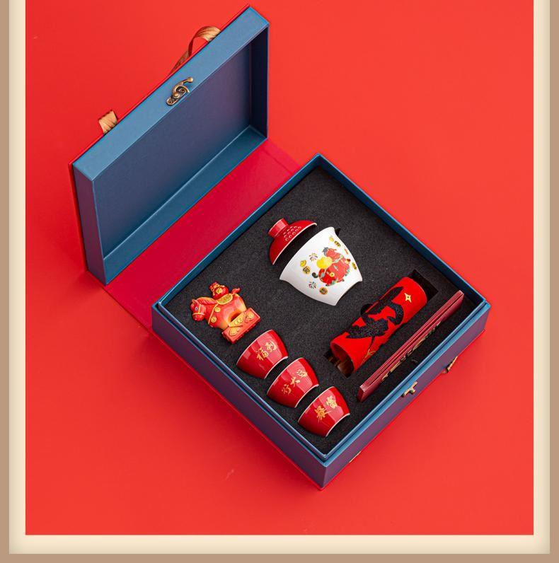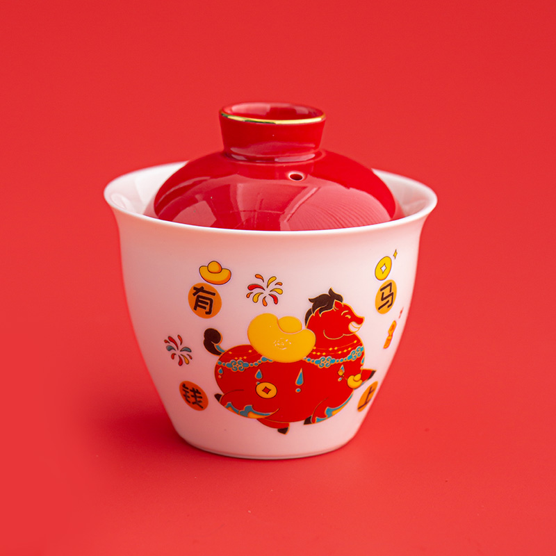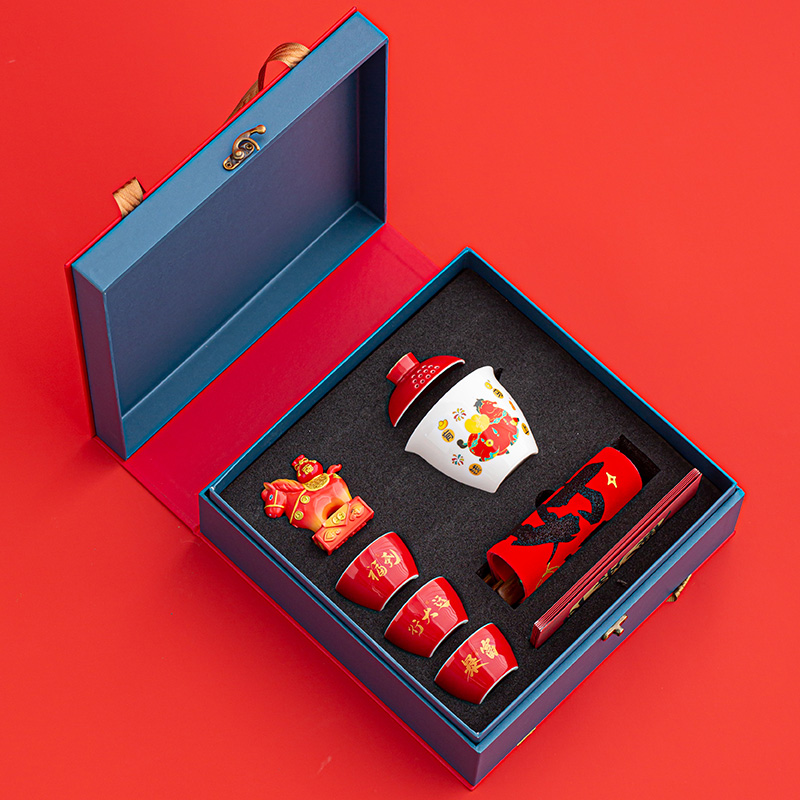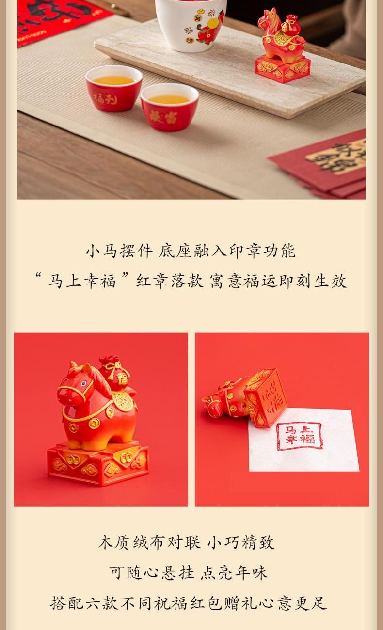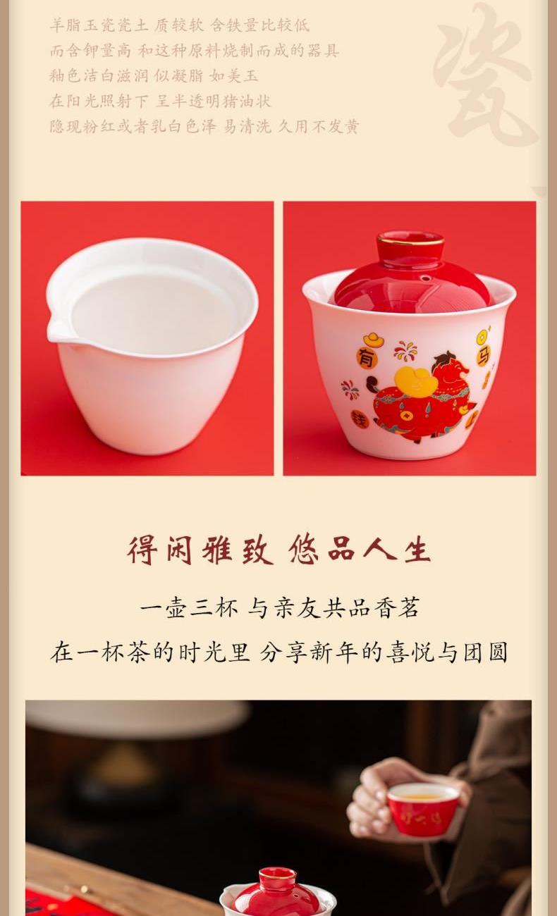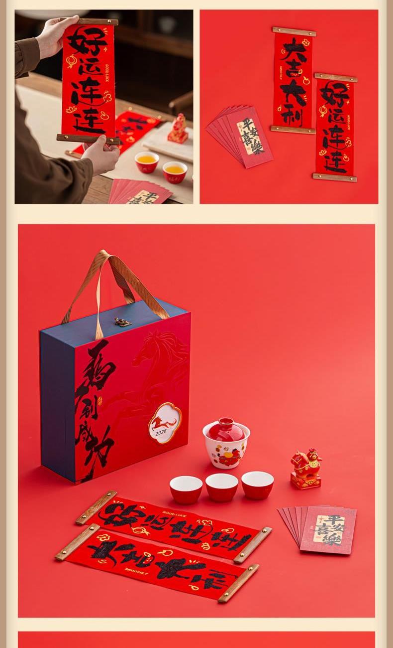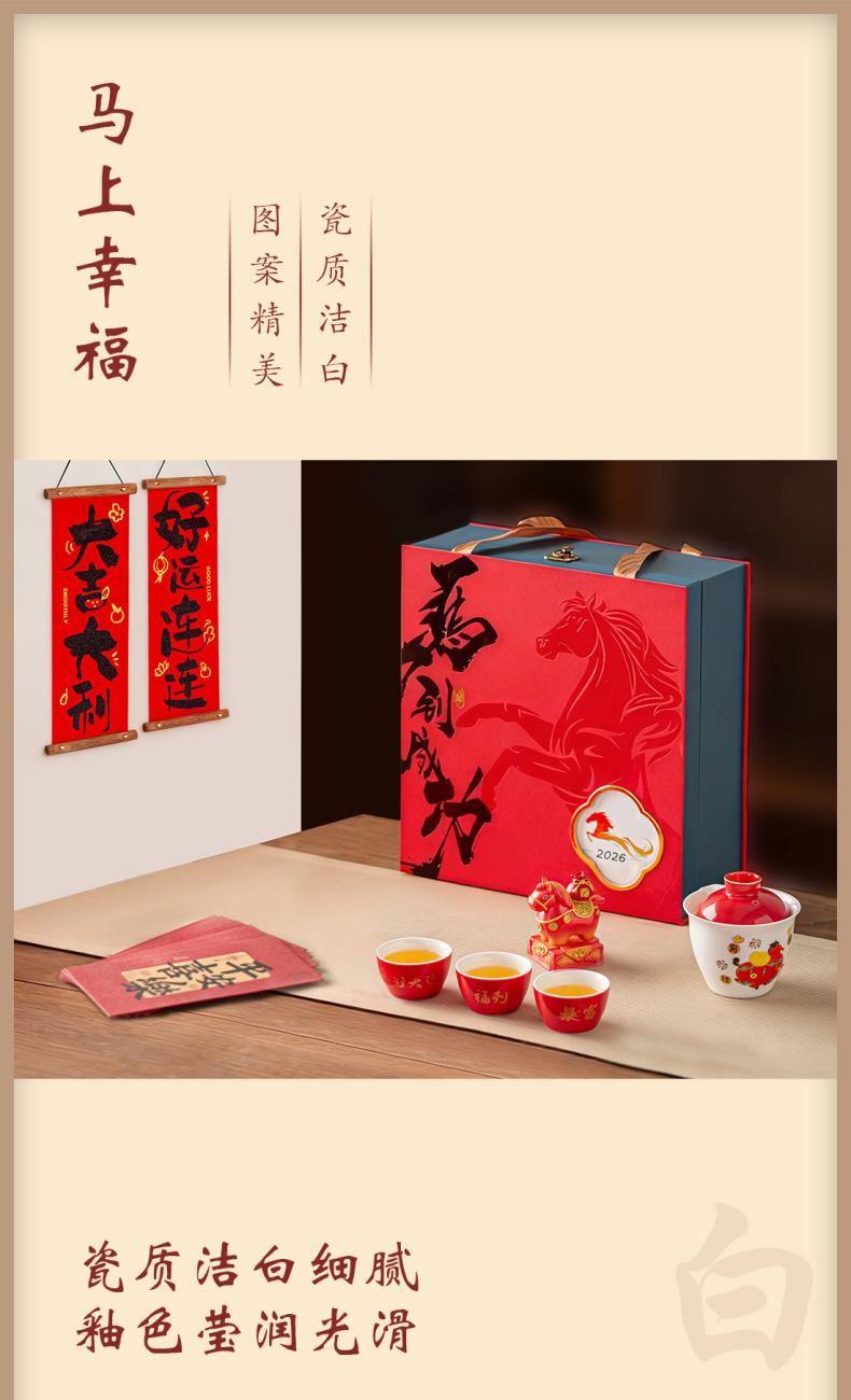 材 质:羊脂玉瓷 容 量:盖碗180ml、茶杯50ml 配 置:盖碗一个,茶杯三个,小马摆件一个,对联一副,红包六个,含提手礼盒包装。 1.羊脂玉瓷易泡壶,温润如玉。酒红描金盖,点缀“马上有钱”祥瑞图案,集实用与美好寓意于一身。 2.小马摆件,底座融入印章功能,“马上幸福”红章落款,寓意福运即刻生效。 3.木质绒布对联,小巧精致,可随心悬挂,点亮年味。搭配六款不同祝福红包,赠礼心意更足。 4.一壶三杯,与亲友共品香茗。在一杯茶的时光里,分享新年的喜悦与团圆。