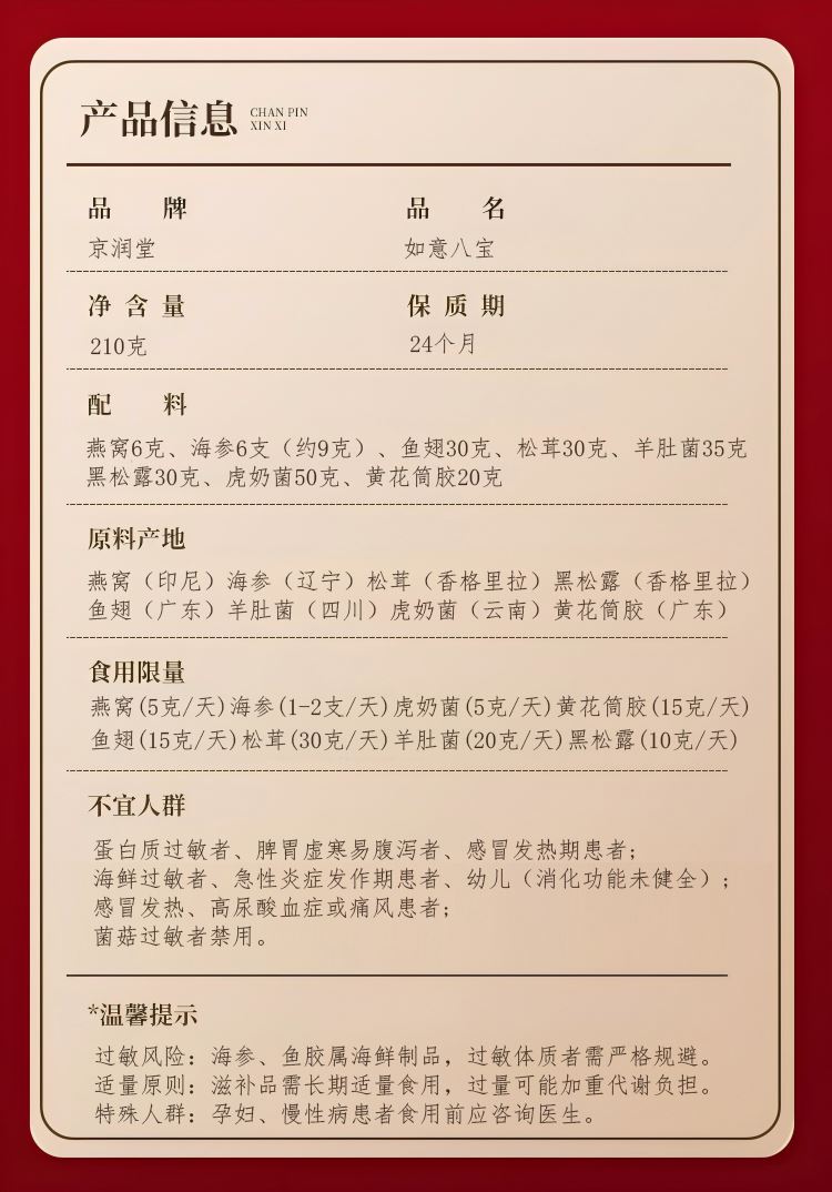 规格:燕窝6克、海参6支、鱼翅30克、松茸30克、羊肚菌35克、黑松露30克、虎奶菌50克、黄花筒胶20克 卖点: ✅ 珍贵食材 精挑细选 ✅ 传统滋补 现代工艺 ✅ 高贵礼赠 彰显品味 ✅ 四季养生 倍添活力 一份礼盒,八重滋养,百分诚意🎉