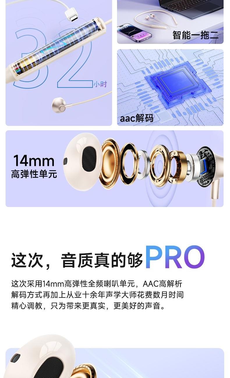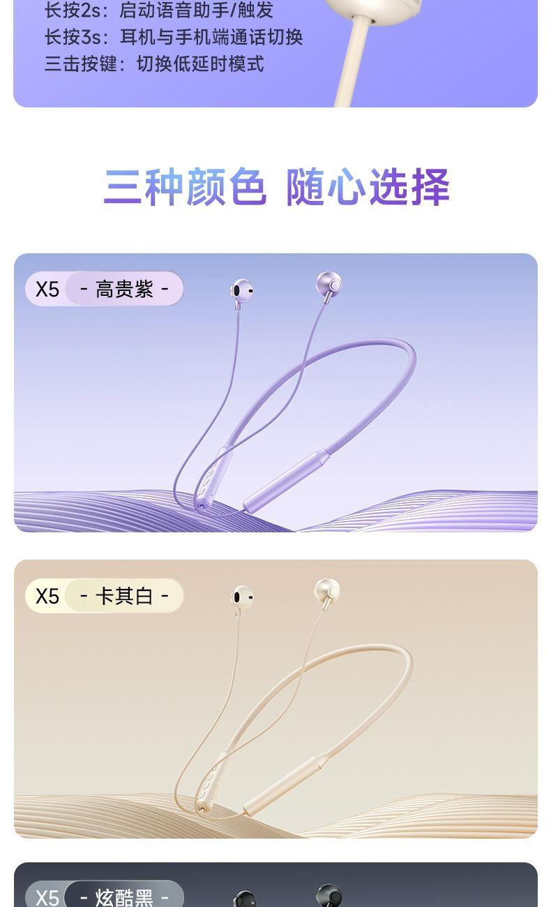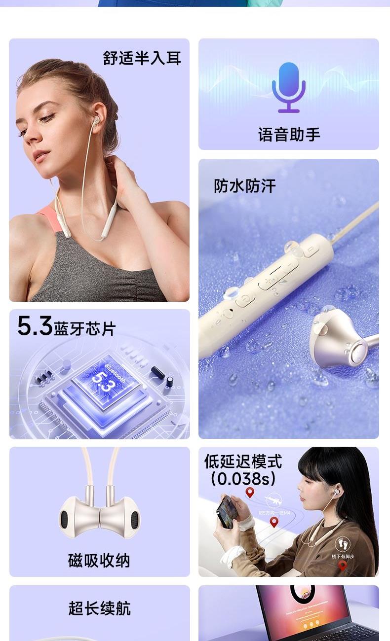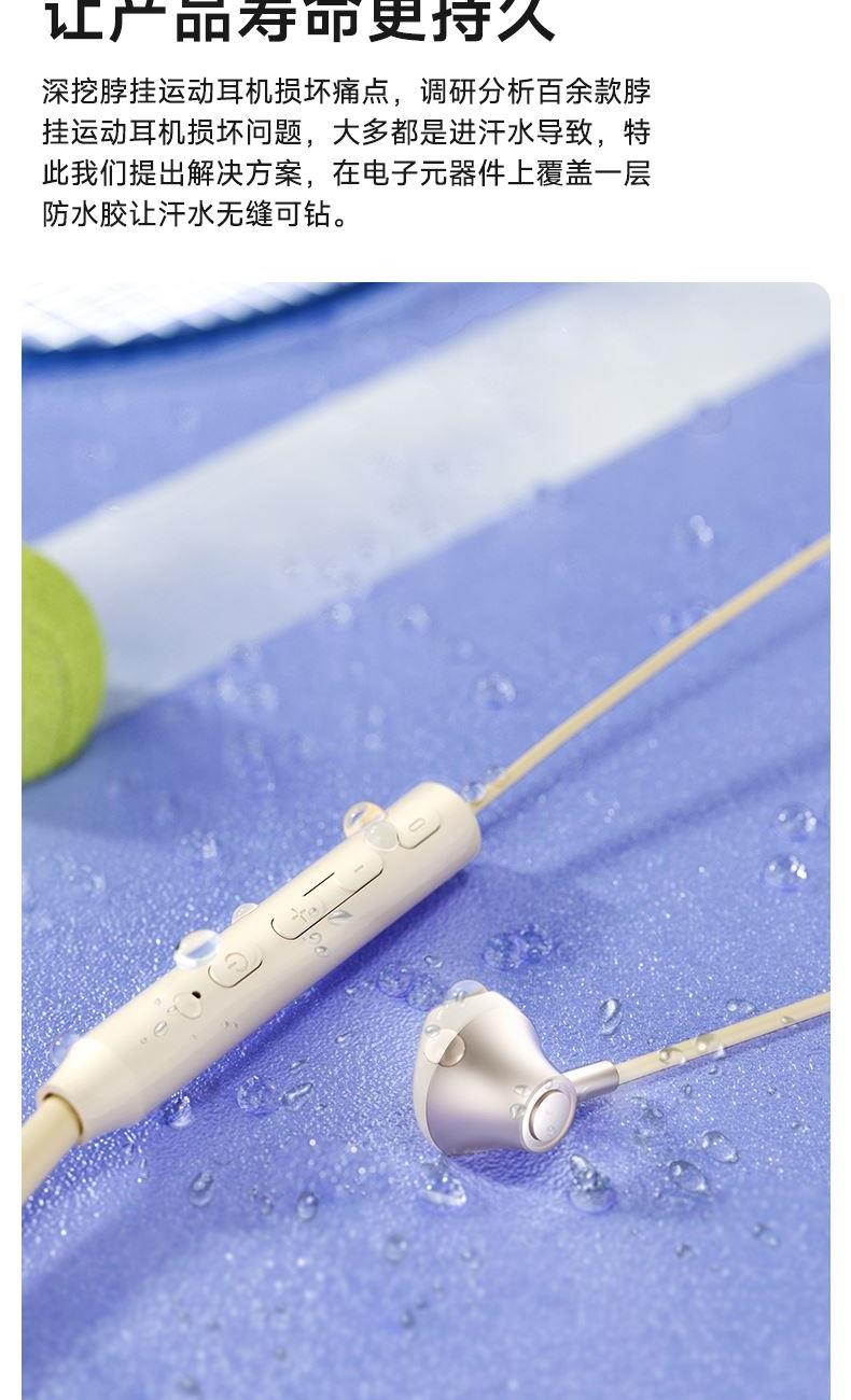 颜色:黑色、卡其白 产品类型:挂脖式耳机 声道系统:双声道 控制方式:按键 蓝牙方案:AC7003F4 蓝牙版本:V5.3 支持蓝牙协议:A2DP、AVRCP、HSP、HFP 蓝牙有效距离:10m 电池容量:110mAh 使用时间(70%音量):≈12h 1、磁吸收纳 2、久戴不痛 3、防水防汗,IPX54防水