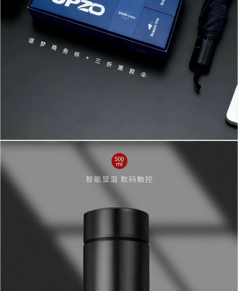 产品内容: 1、三折手动黑胶伞 规格:直径95CM 伞架:合金纤维骨架 面料:190T黑胶布 手柄:配色塑胶手柄 2、逐梦系列商务温控杯 材质: 内胆材质304 杯盖PP (加温度显示) 容量: 500ML 礼盒:29.5*15*7CM