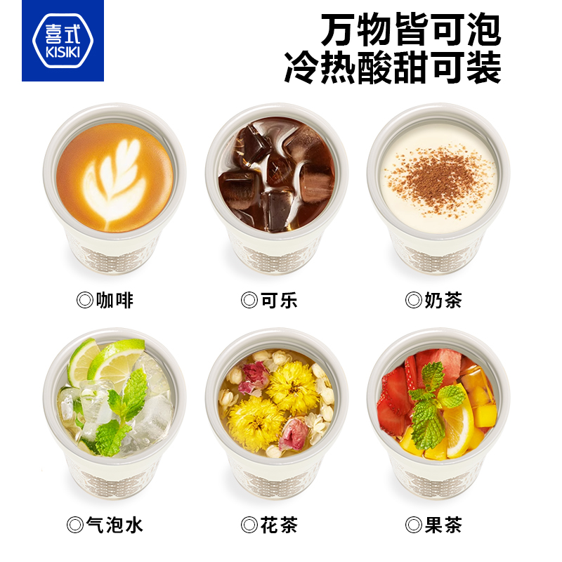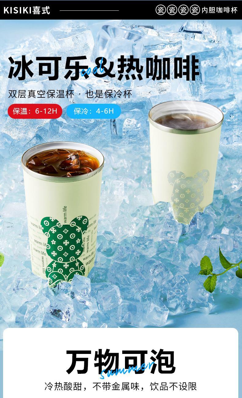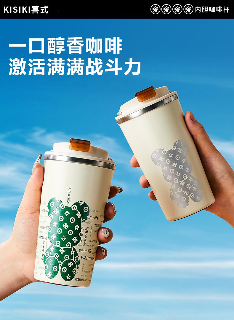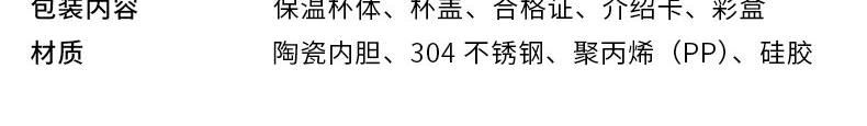 杯身喷塑附着力强、内外304杯体、瓷内胆,易清洗 包装;彩盒 1.黑科技陶瓷内胆:无金属异味 保温 锁鲜 耐酸碱,冷热酸甜都不惧怕 2.百搭魔法杯:咖啡、红茶、果汁、牛奶、都可泡 3.瓷内胆,不易留茶垢,方便清洗更省心 4.使用新型3D喷墨印刷技术,展现凹凸立体质感,将颜色和细微图案一层一层精心的重叠,再现图案的触感 5.杯盖有隐形拉手,出门一提就走 6.硅胶杯垫,既防滑耐磨又静音,有效保护杯底,车载不怕洒水