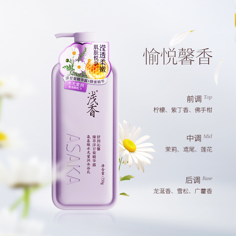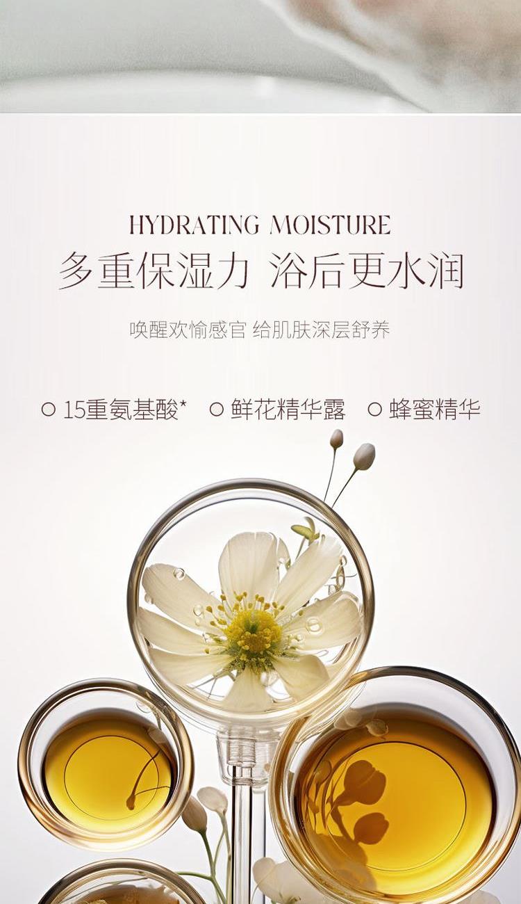 1、水润沁肤,浴享花香。摸得到的香·嫩·滑。多重润养高能保湿,浴享柔滑水嫩肌。15种氨基酸*,呵宠肌肤。3种鲜花纯露,洋甘菊:薰衣草、茉莉花:润泽美肌。蜂蜜精华:水润滋养。 2、营养质地更浓厚,弱酸更亲肤。多重精华,质地较为浓稠。弱酸亲肤,更安心。 3、洗走疲倦浅香萦绕,开启愉悦身心之旅。水光蜜润沐浴乳,宛如冬日暖阳照拂,感受清甜暖心的花香。