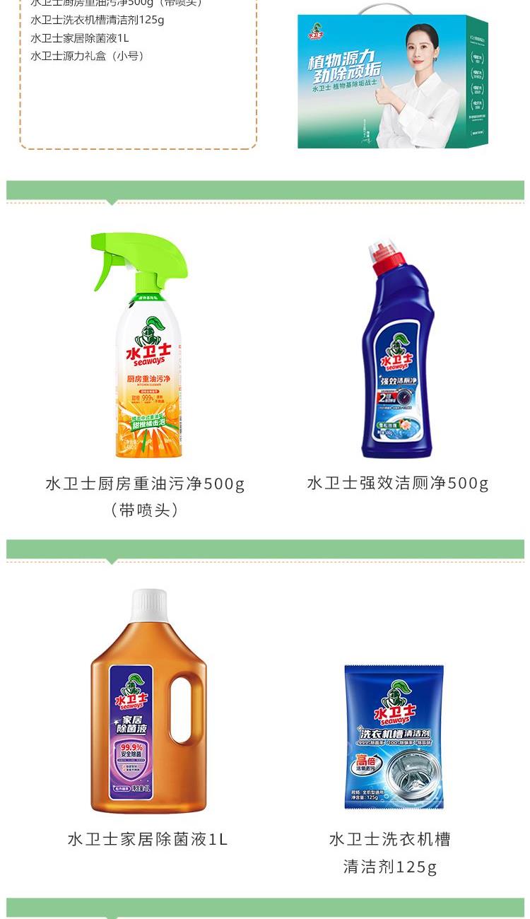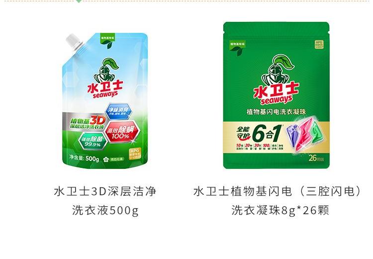 水卫士植物基闪电(三腔闪电)洗衣凝珠8g*26颗 水卫士3D深层洁净洗衣液500g 水卫士强效洁厕净500g 水卫士厨房重油污净500g(带喷头) 水卫士洗衣机槽清洁剂125g 水卫士家清液1L 思珀莱源力礼盒(净含量2833g 小号)