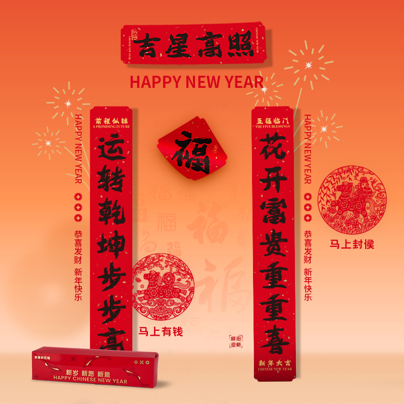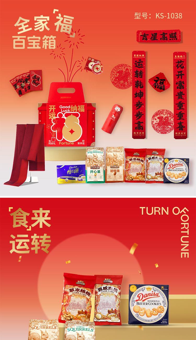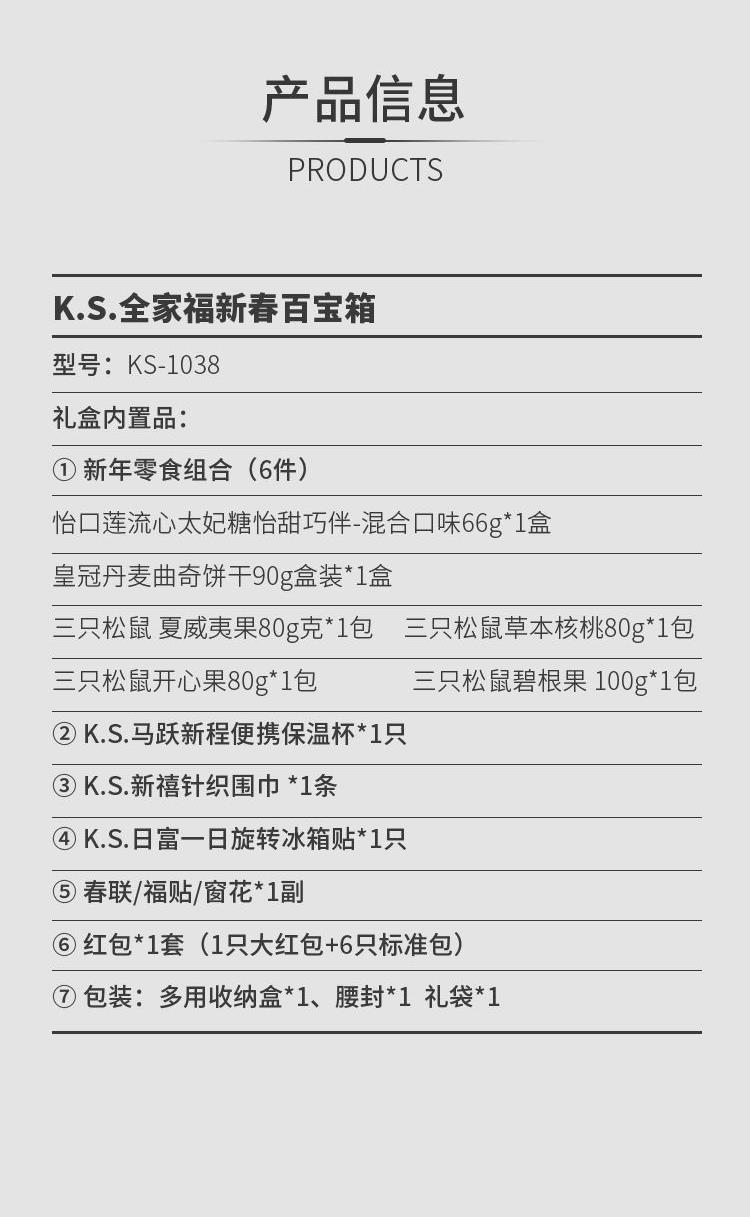 多样搭配,内容丰富。不但汇聚传统年味(春联、红包、窗花),而且精选零食六件装、生活好物(保温杯、围巾、冰箱贴),兼顾情怀与实用。