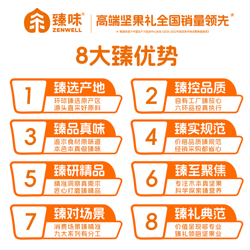 臻味-100g美国原色开心果*1 臻味-100g南非碧根果*1 臻味-100g澳洲巴旦木*1 臻味-100g澳洲夏威夷果*1 臻味-200g菲律宾黄蕉干*1 臻味-200g土耳其金提干*1 臻味-300g阿联酋椰枣*1 臻味-300g泰国龙眼干*1 环球臻味,采用烫金工艺材质,整体气质时尚沉稳;内配4种坚果,4种果干