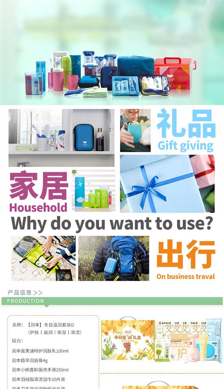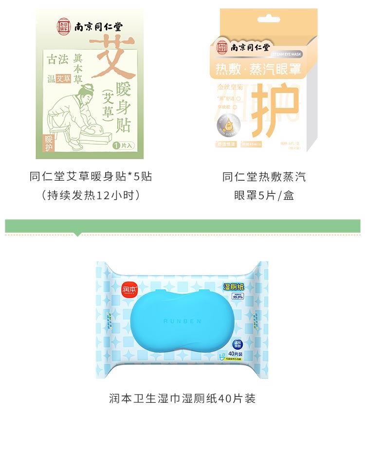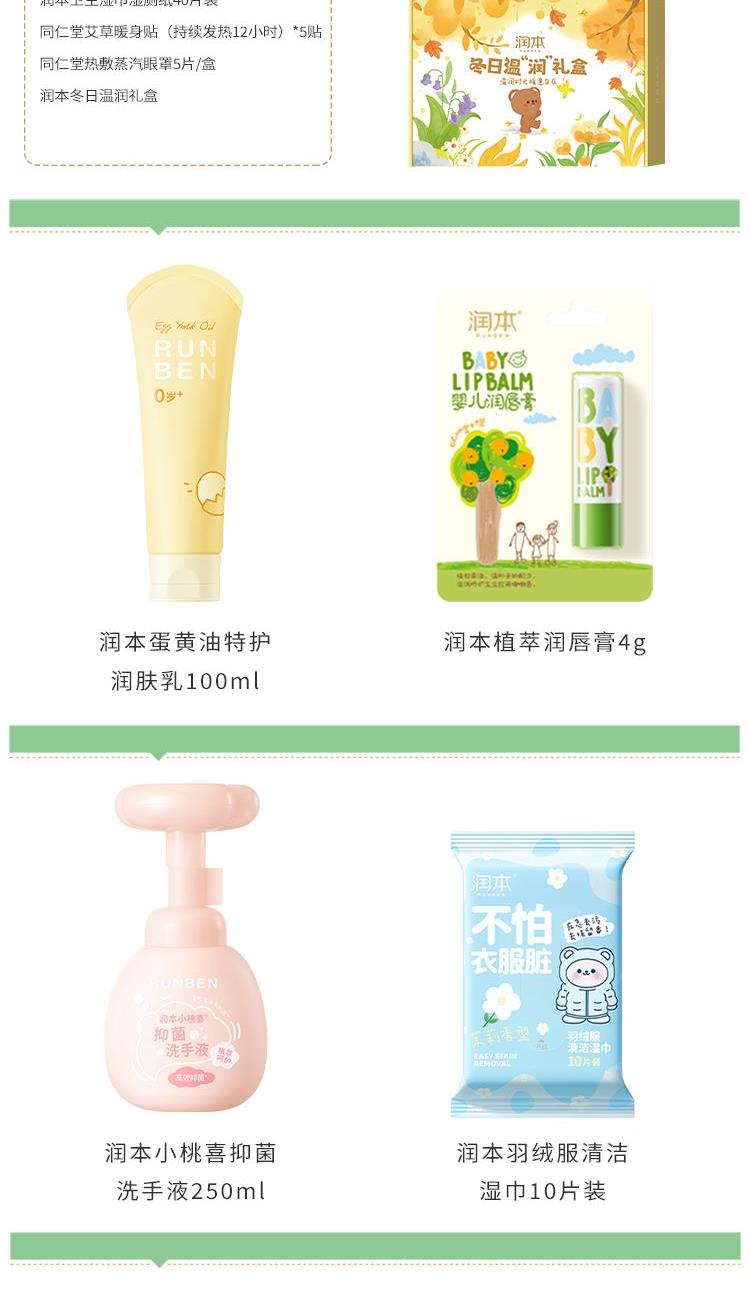 润本蛋黄油特护润肤乳100ml 润本植萃润唇膏4g 润本小桃喜洗手液250ml 润本羽绒服清洁湿巾10片装 润本卫生湿巾湿厕纸40片装 同仁堂艾草暖身贴(持续发热12小时)*5贴 同仁堂热敷蒸汽眼罩5片/盒 润本冬日温润礼盒