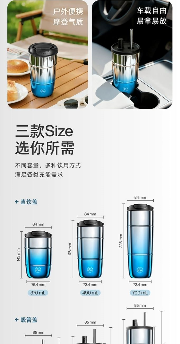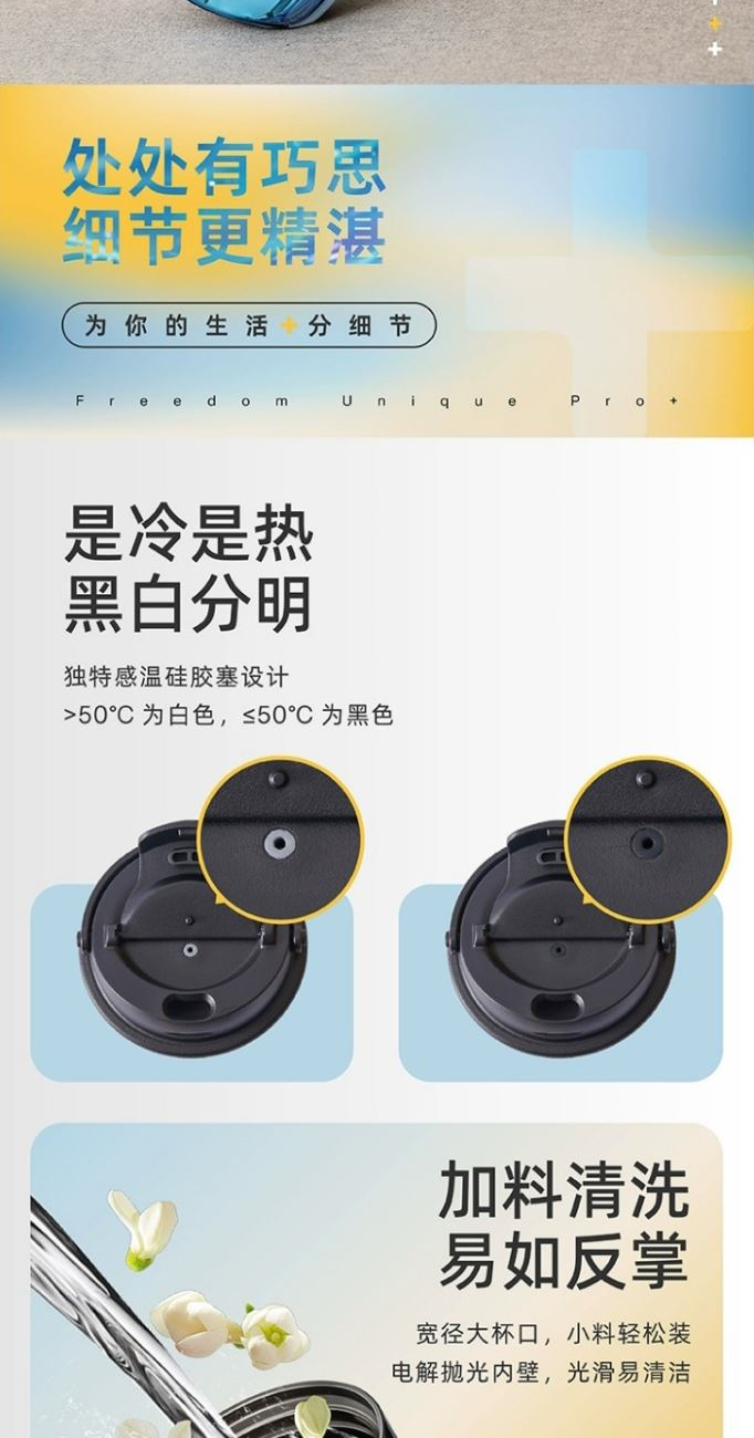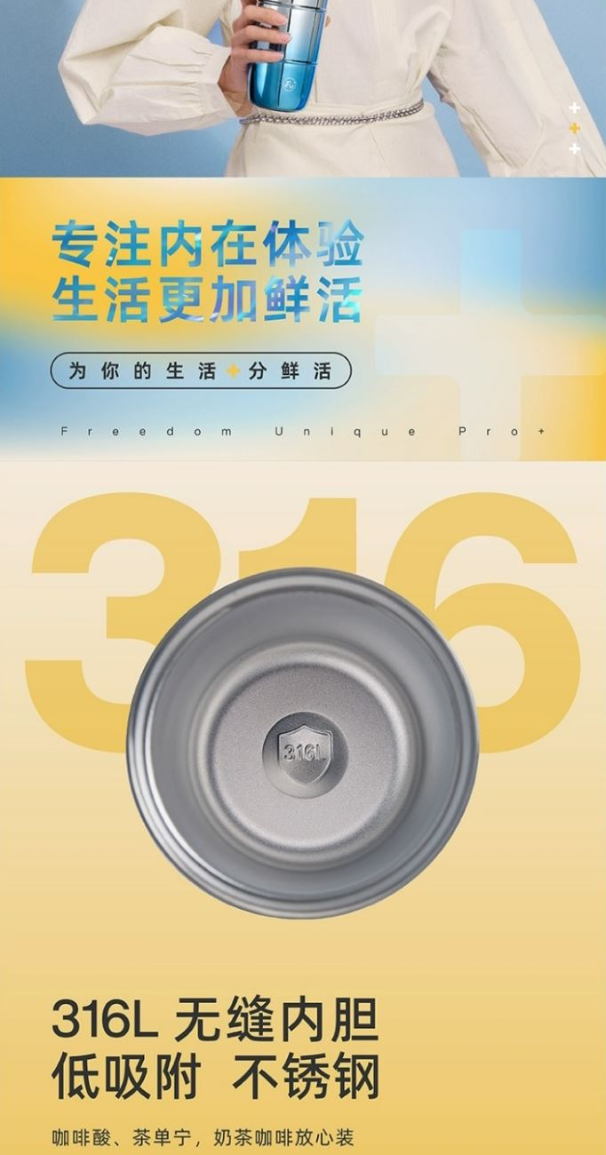 容量:370ml 颜色:电镀蓝 电镀金 电镀紫 尺寸:84*143mm 材质:严选316不锈钢内胆,采用镀铜真空工艺, 强效保温保鲜。 独特感温硅胶塞设计,饮用不怕烫嘴。 一杯双盖,饮水方式随心切换,防丢杯盖设计。 包装:单瓦盒