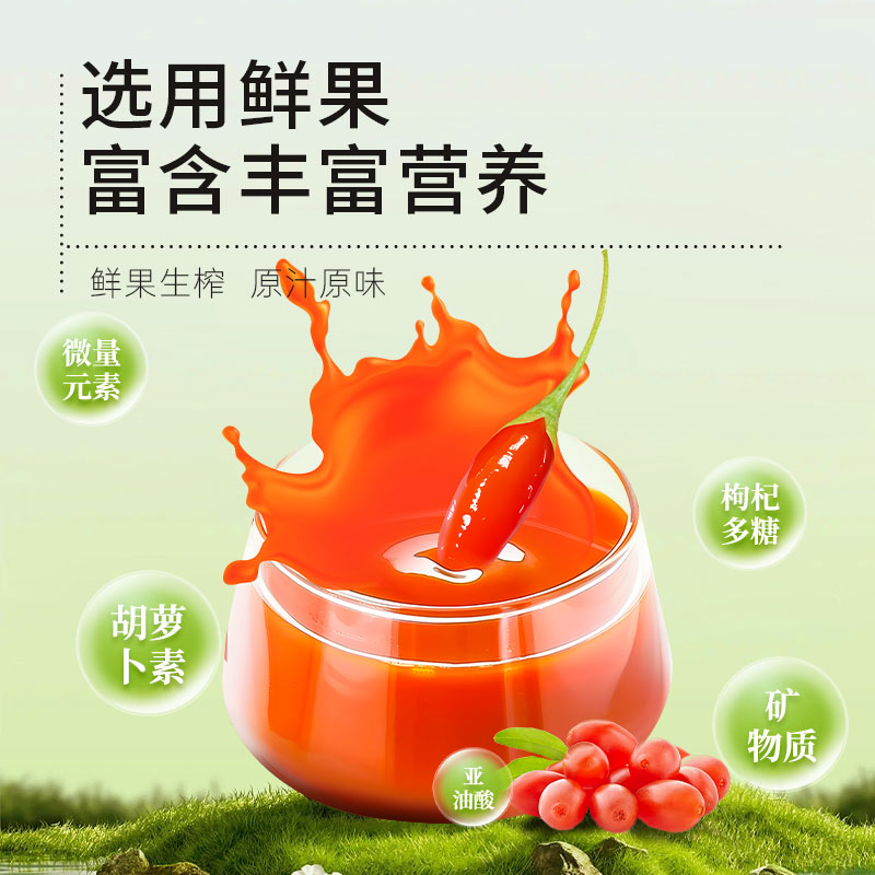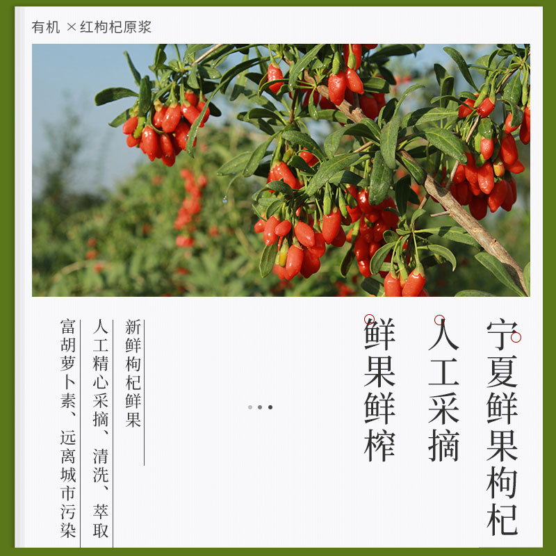 【配 料】 采用中宁鲜果枸杞汁 【产 地】 宁夏·中宁 【保 质 期】 18 个 月 【规 格】50ml*12瓶/盒 【优 势】 杞果小圣枸杞鲜浆BRC认证,欧盟有机认证,德国有机认证,枸杞鲜浆的吸收率却可以达到99.99%。 杞果小圣枸杞鲜浆采用NFC工艺,超低温破碎和生物活性稳定技术,可以让鲜果在破碎保留营养素不流失。独特的生物酶解技术,可以让枸杞原浆能够更好的为人体所吸收,避免浪费。