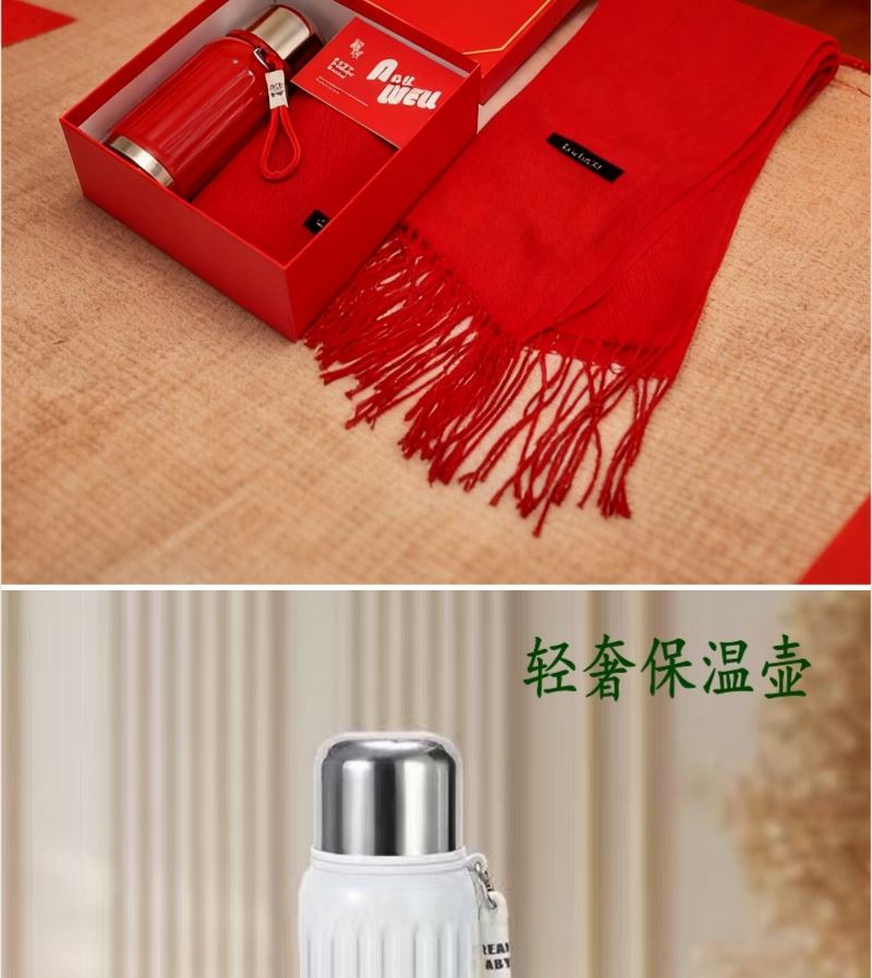 围巾:成份: 聚酯纤维 规格: 70cm×200cm×1条 克重: 200克每条 保温杯:内胆材质316 内盖PP 外盖201 容量: 450ML 礼盒: 20×20×9.5cm 天地盖硬盒