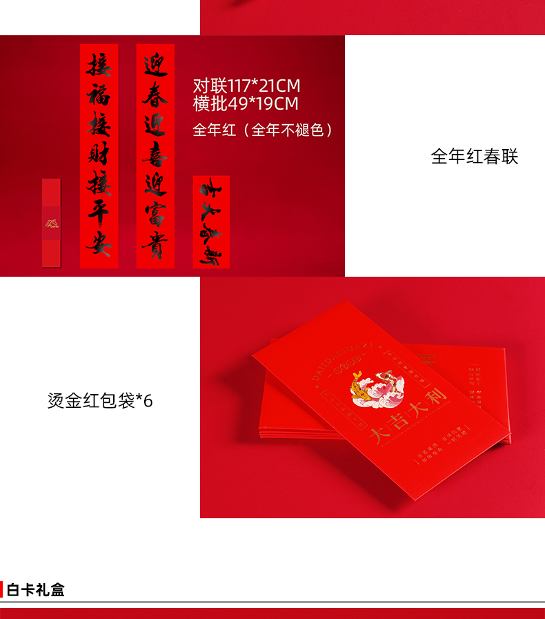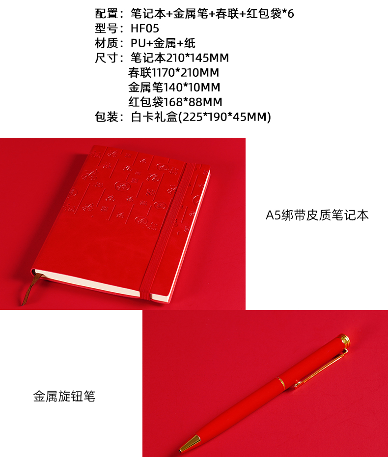 配置:笔记本+金属笔+春联+红包袋*6 型号:NF05 材质:PU+金属+纸 尺寸:笔记本210*145mm 春联1170*210mm 金属笔140*10mm 红包袋168*88mm 包装:白卡礼盒(225*190*45mm)