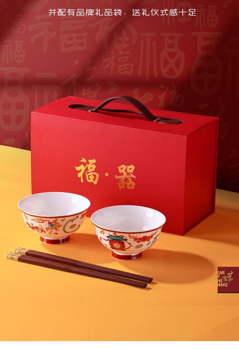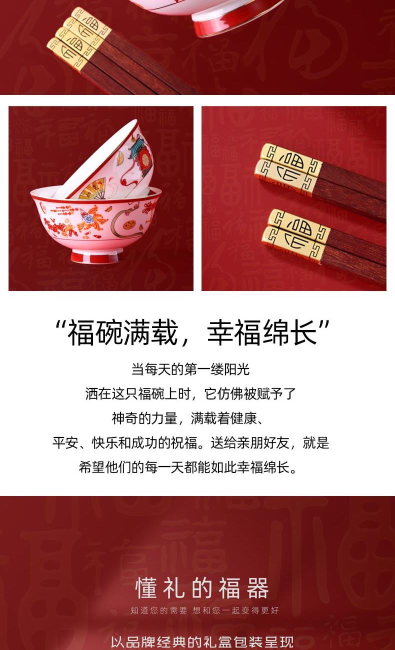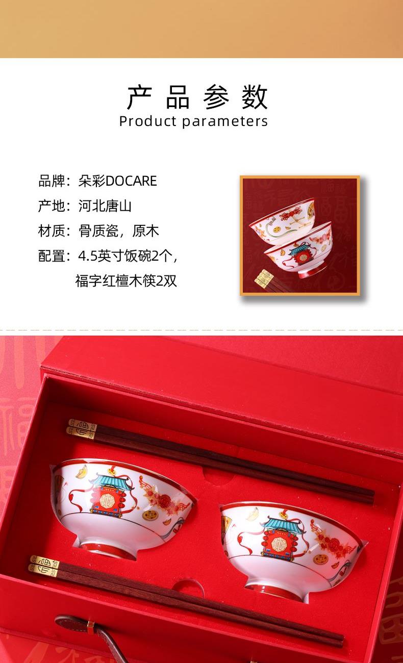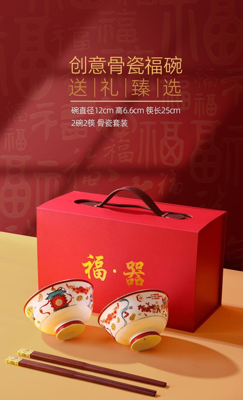 产品规格:福字红檀木筷2双,4.5英寸骨瓷碗2个。 产品材质:骨质瓷+原木木筷 产品花色:迎春闹福 包装方式:礼盒 单套重量:0.9KG 彩盒尺寸: 302*135*175mm