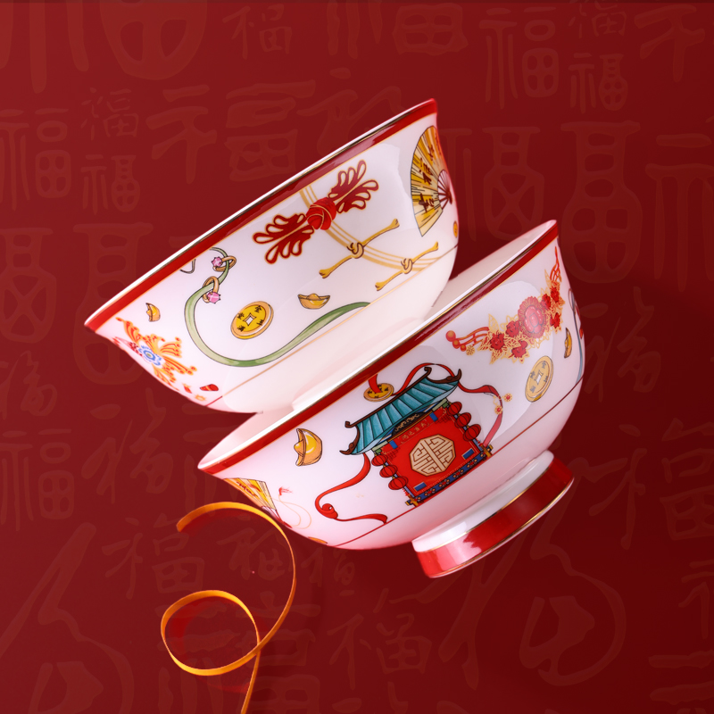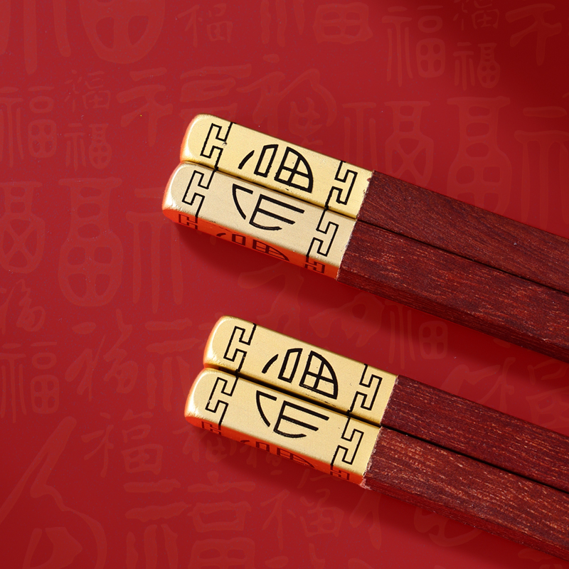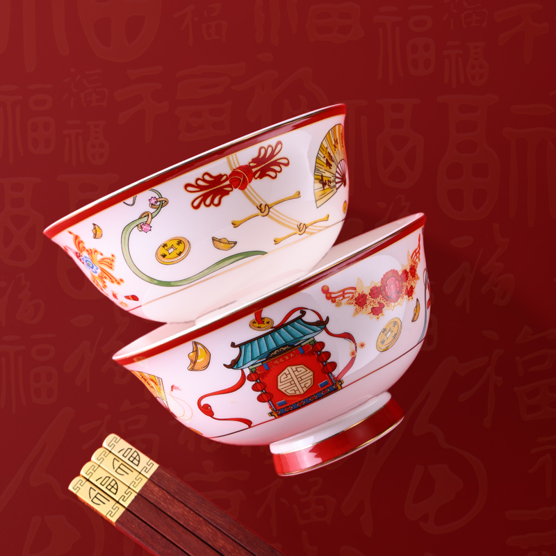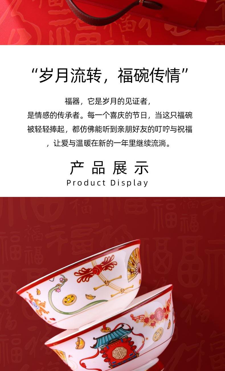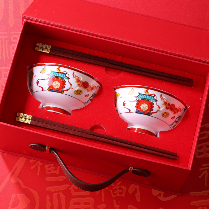 产品规格:福字红檀木筷2双,4.5英寸骨瓷碗2个。 产品材质:骨质瓷+原木木筷 产品花色:迎春闹福 包装方式:礼盒 单套重量:0.9KG 彩盒尺寸: 302*135*175mm