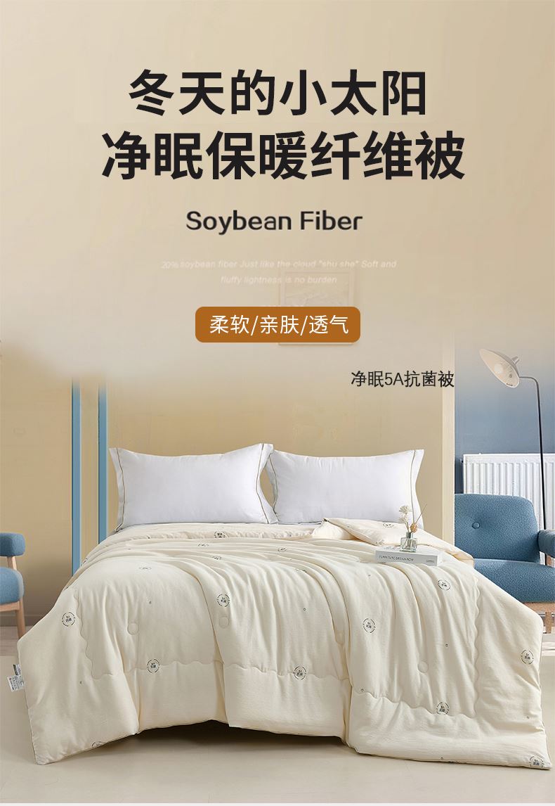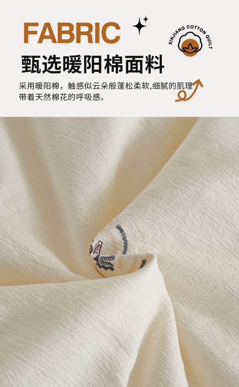 1.面料采用特制暖阳棉,触感似被春日晒透的云朵般蓬松柔软,细腻的肌理带着天然棉花的呼吸感,贴身接触时仿佛被温柔拥抱。这种独特面料在纺织过程中融入天然成分,形成洁净的睡眠环境,特别适合易敏体质与呵护肌肤需求的人群。