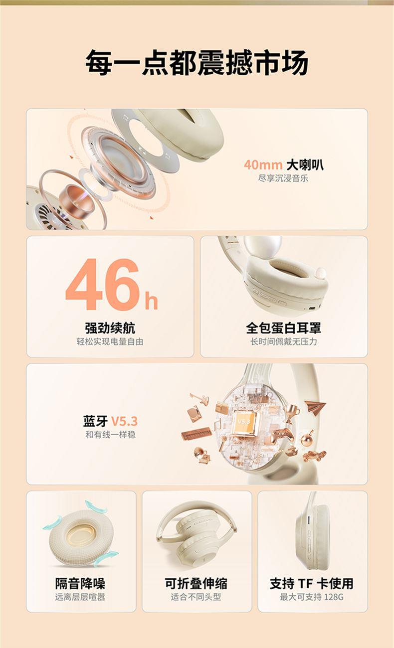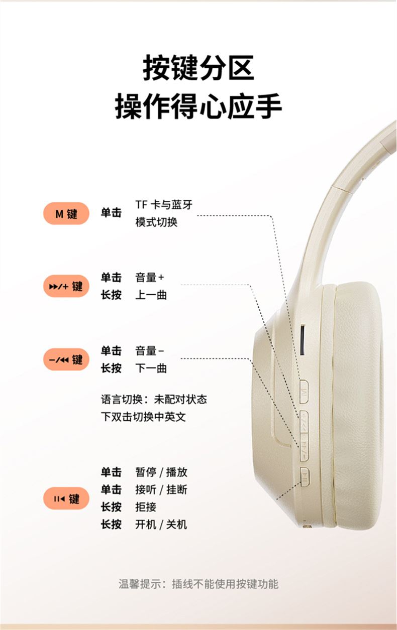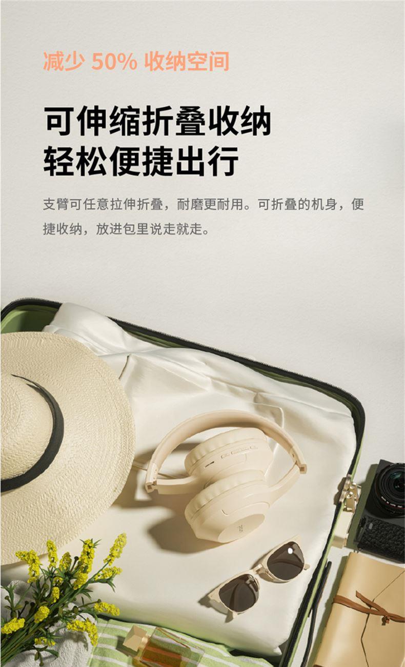 颜色:黑色、卡其白、白灰色 蓝牙方案:JL7006 蓝牙版本:V5.3 蓝牙距离:10m 频响范围:20HZ-20KHZ 电池容量:300mAh 使用时间(70%音量):≈30h 喇叭尺寸:40mm 喇叭灵敏度:98±3DB 充电接口:TYPE-C 1、可拉伸折叠 2、音乐游戏低延迟 3、支持插TF卡 4、支持AUX有线连接