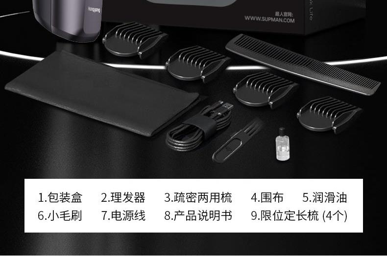 包装清单:1.包装盒 2.理发器 3.疏密两用梳 4.围布 5.润滑油 6.小毛刷 7.电源线 8.产品说明书 9.限位定长梳 (4个)