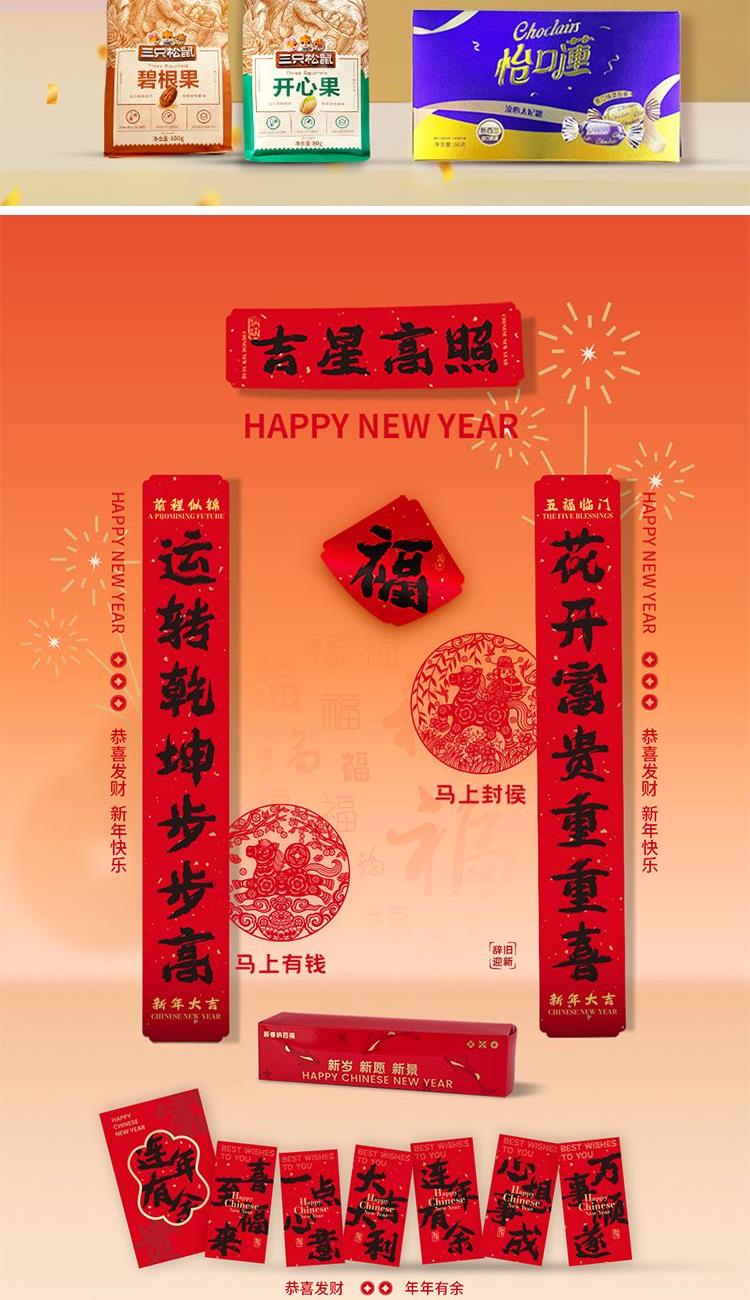 多样搭配,内容丰富。不但汇聚传统年味(春联、红包、窗花),而且精选零食六件装、生活好物(斜挎包、充电宝、冰箱贴),兼顾情怀与实用。
