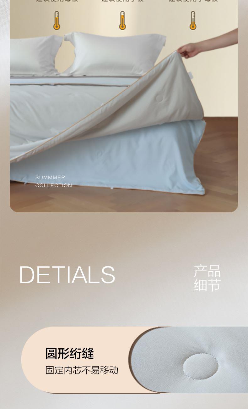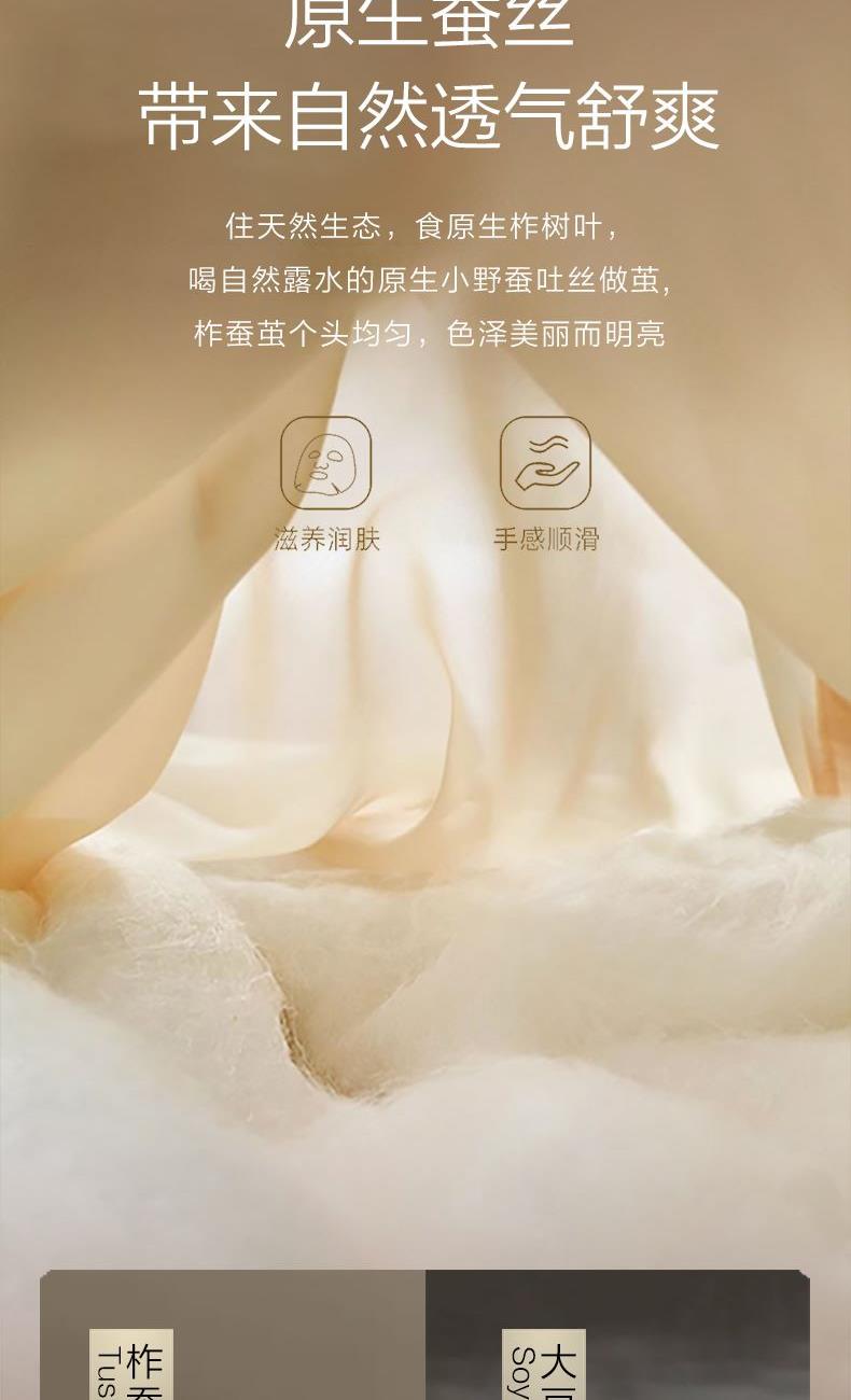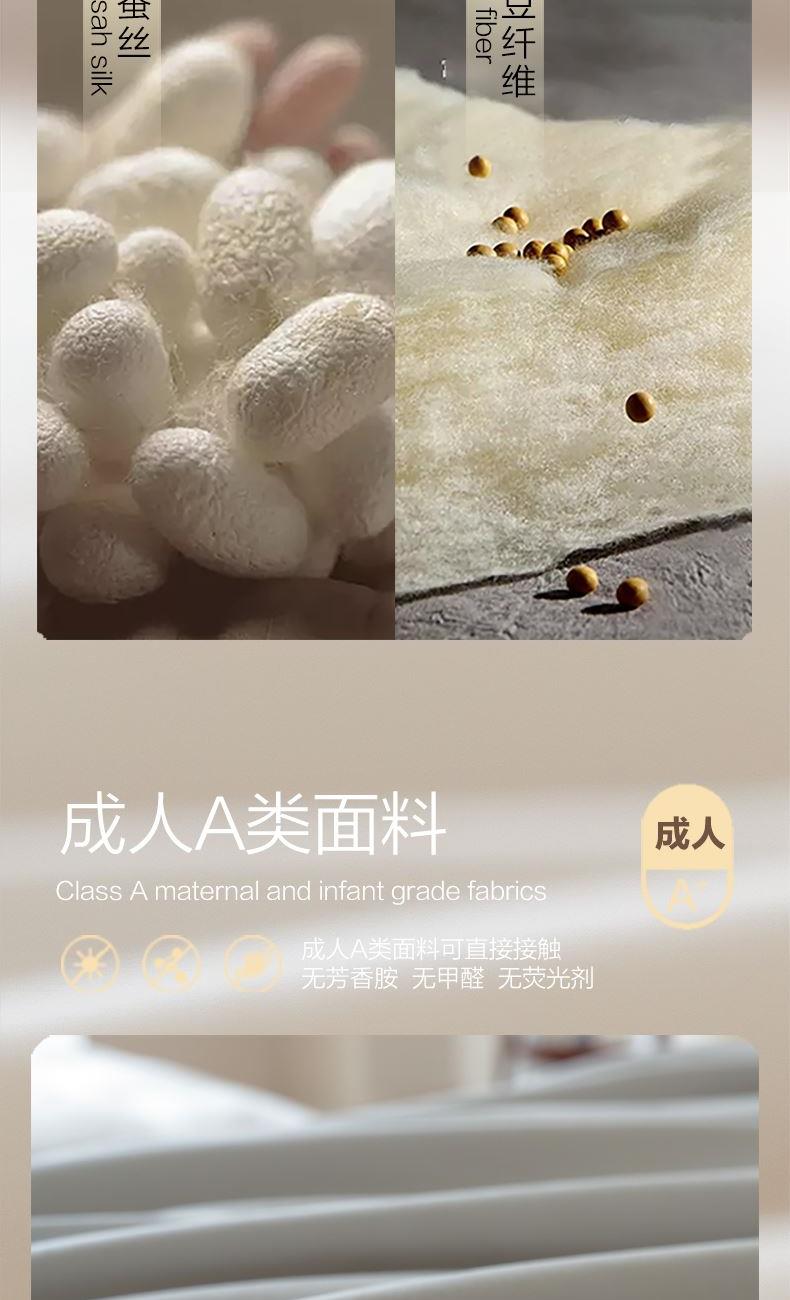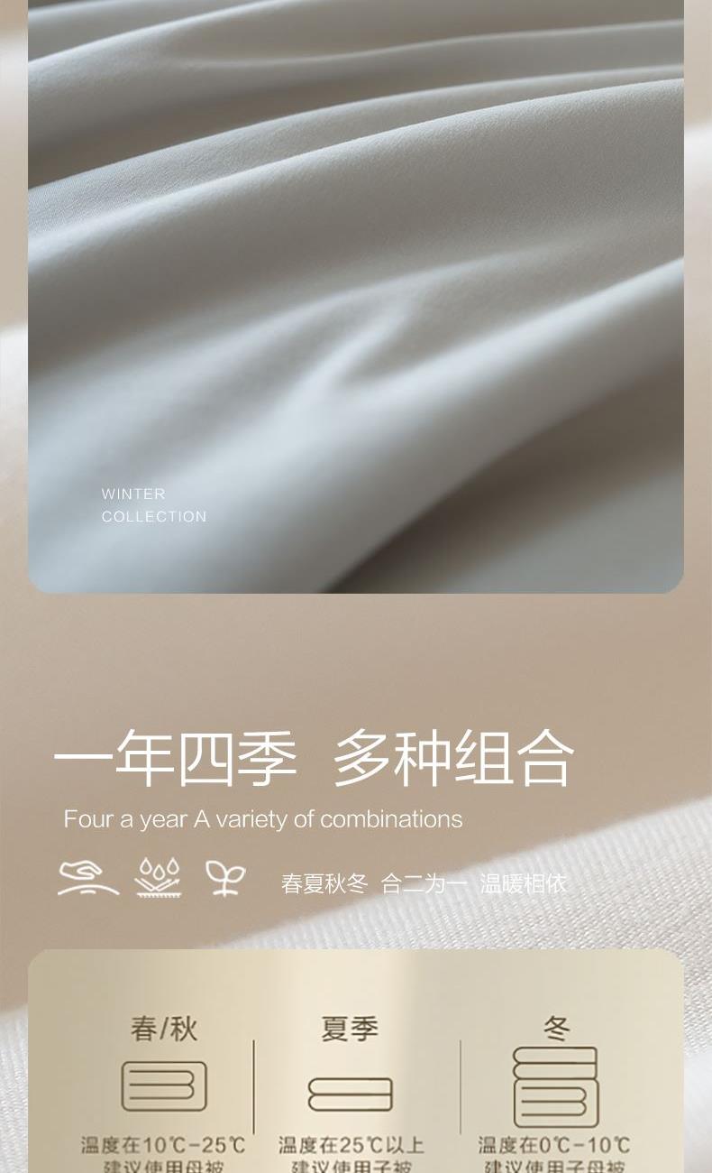 产品规格:220*240CM/420+1200g(填充克重) 产品材质:聚酯纤维 产品填充:子被:柞蚕丝/420g 母被:20%大豆80%聚酯纤维/1200g 装包率:6条/包 1、A类面料采用超柔面料,子母被搭配,多种组合适应一年四季,整条被子软糯轻盈,触感温润。 2、合理配比采用20%大豆纤维+80%超细纤维填充,具有羊绒般柔软手感,棉的保暖性和蚕丝般的贴肤性 3、 简约绗缝,固定填充,不易跑绒。轻盈不压身。