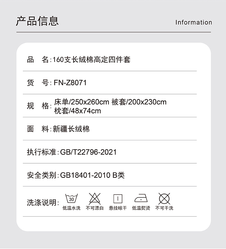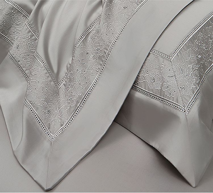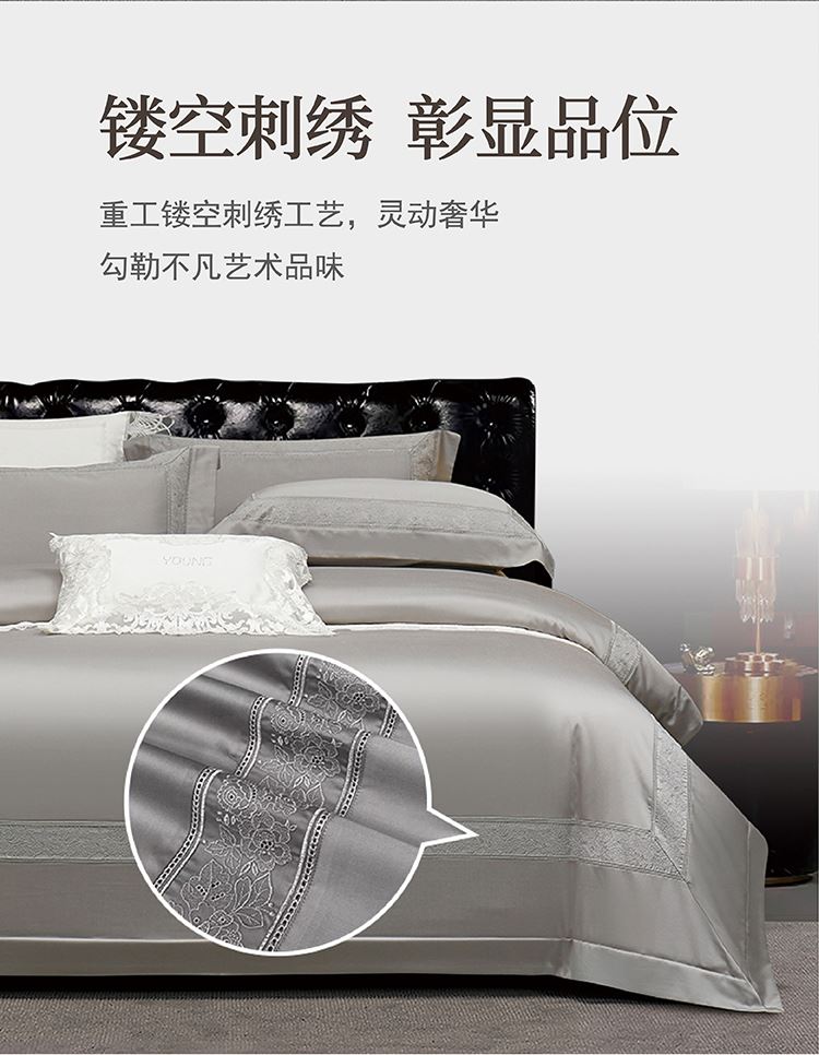 床单:250x260cm 被套:200x230cm 枕套:48x74cm 【面 料】新疆长绒棉 (160支长绒棉) 产品特点: 1. 面料选用160支新疆长绒棉,棉中奢品,高支高密,蚕丝般丝滑,柔软舒适; 2.重工镂空刺绣工艺,灵动奢华,勾勒不凡艺术品味; 3.活性印染,环保,色牢度高,不易褪色; 4.床单圆角贴边设计,品质。