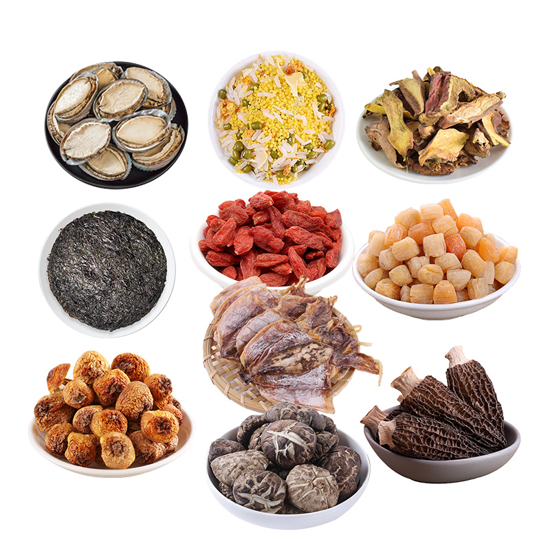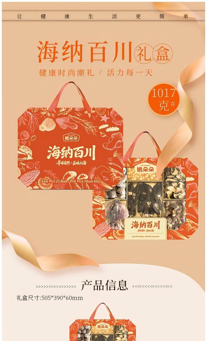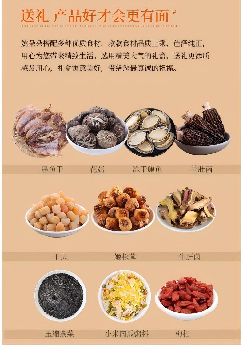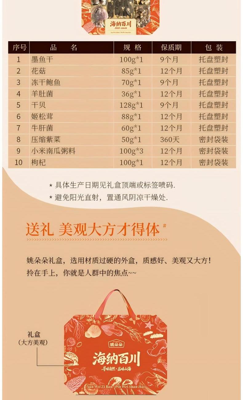 花菇85克 羊肚菌36克 干贝128克 姬松茸88克 牛肝菌60克 墨鱼干100克 压缩紫菜50克 冻干鲍鱼70克 小米南瓜粥料100克*3袋 枸杞100克 海纳百川礼盒