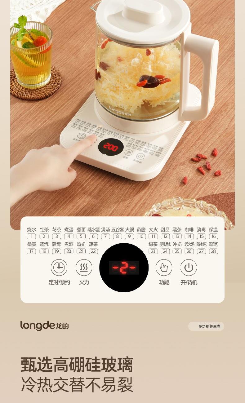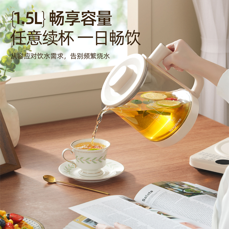额定功率:800W 产品容量:1.5L 额定电压:220V~ 产品频率:50Hz 产品净重:1.3kg 产品毛重:1.7kg 整箱重量:21.5kg 装 箱 数:12台/箱 高硼硅玻璃壶身高硼硅玻璃冷热交替不易裂 触控菜单选择二十八大触控菜单选择,数码显示,防干烧 功率可调8段功率可调 时间可调24小时预约,180分钟定时可调