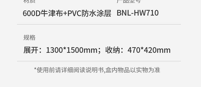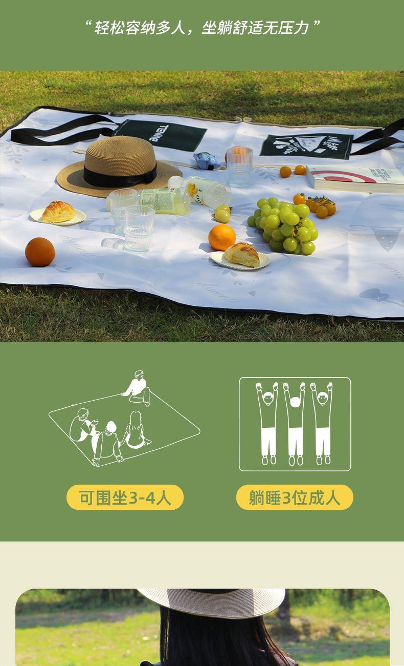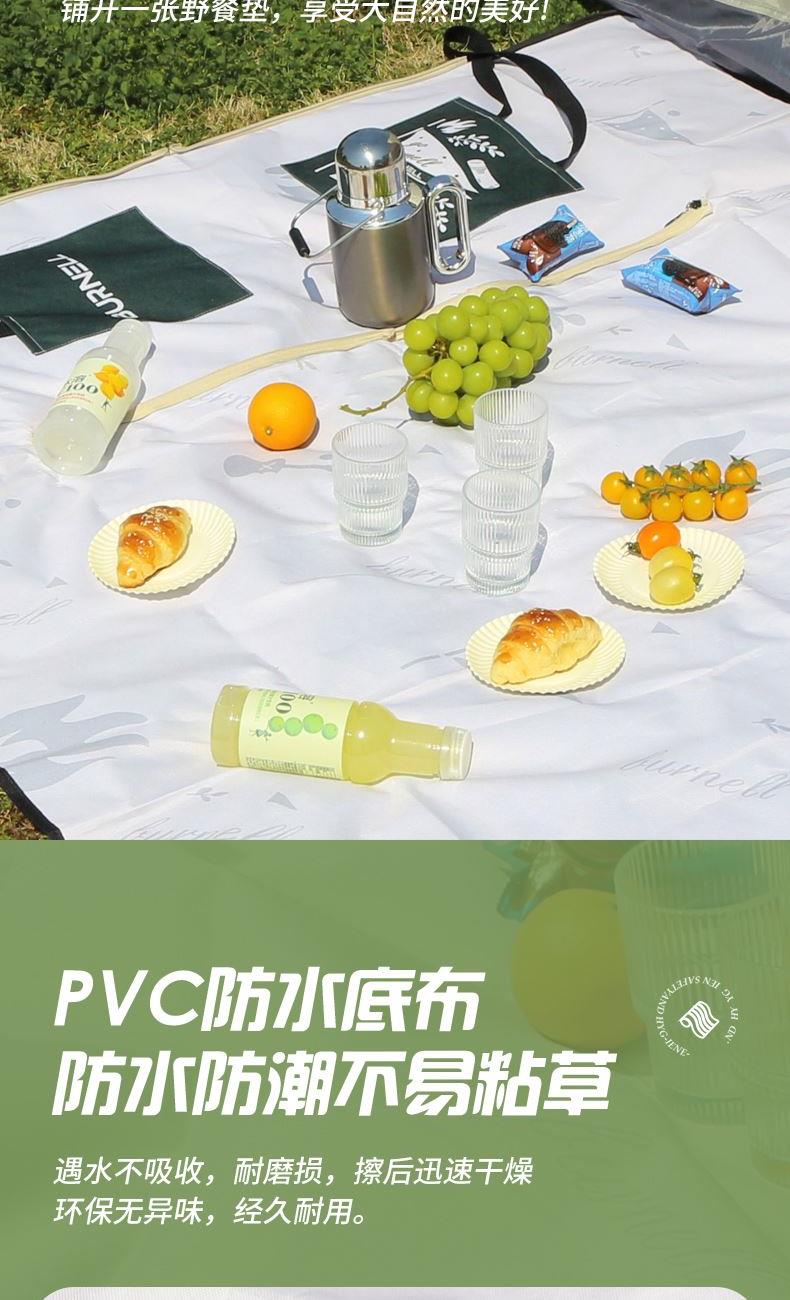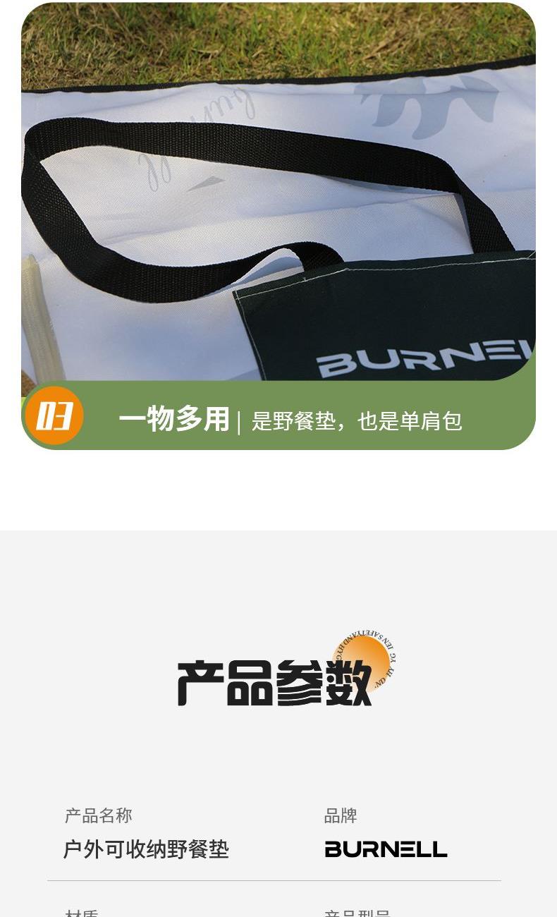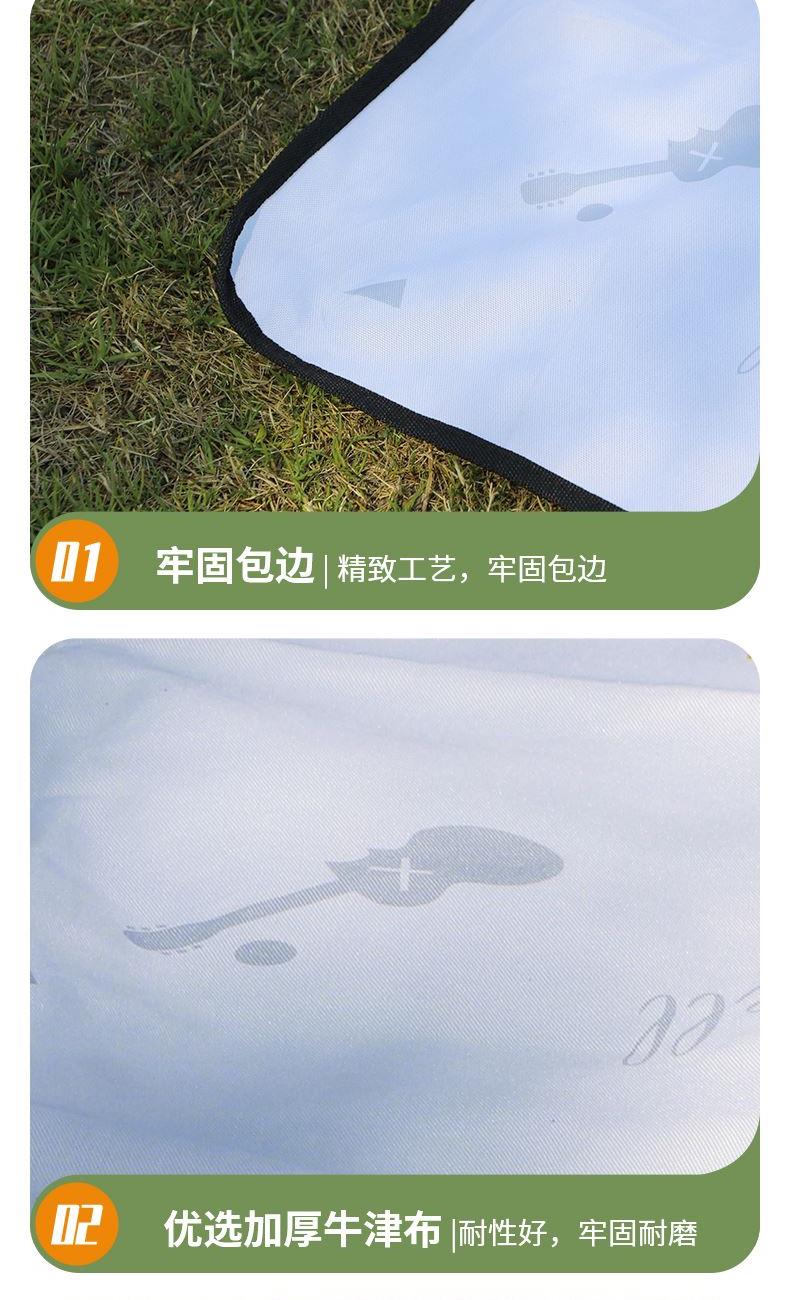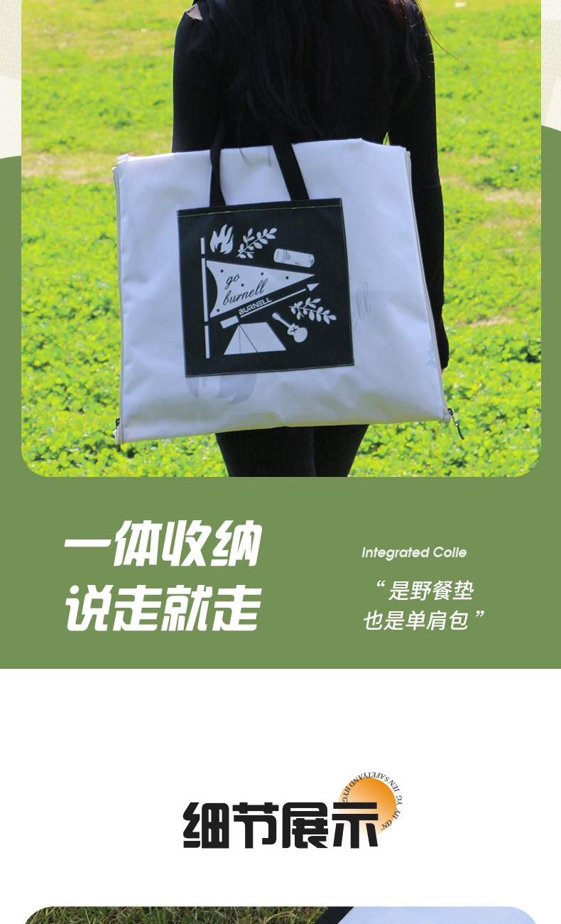 材 质:600D牛津布+PVC防水涂层 规 格:展开:1300*1500mm 收纳:470*420mm 配 置:野餐垫*1 装 箱 数:24pcs/箱 一物多用,是野餐垫,也是单肩包,将户外和日常相结合; 单肩包三层分区设计,实现分区存放,避免混乱,轻松外带,即背即走; 优选加厚牛津布,耐性好,牢固耐磨; 野餐垫背面防水层,防水防潮防湿气,轻松去污