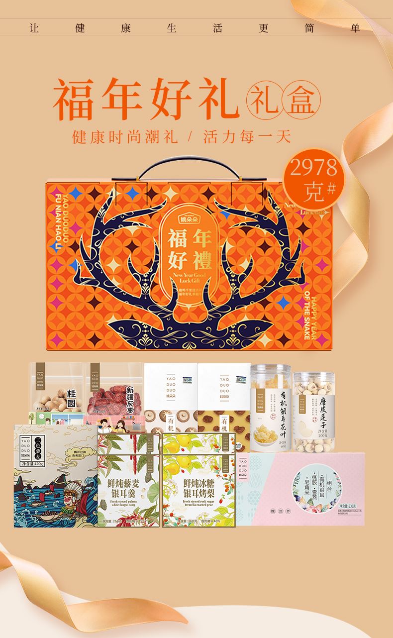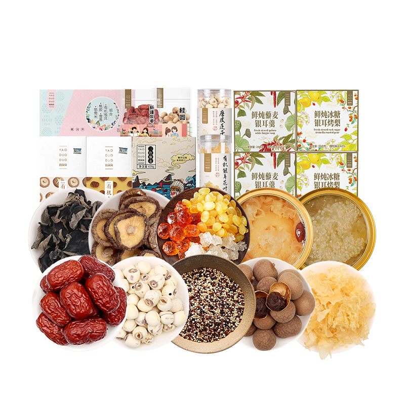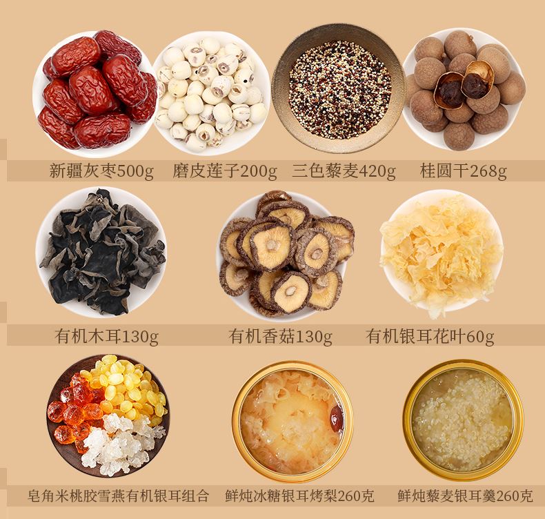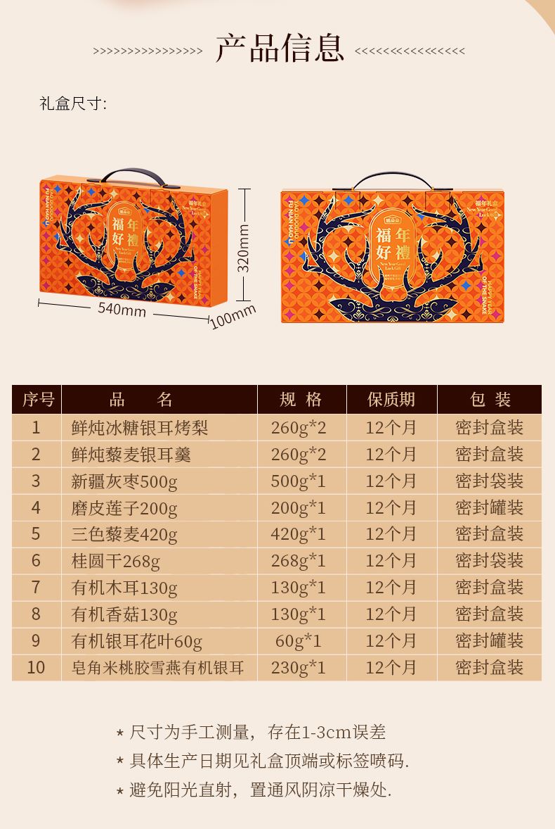 鲜炖冰糖银耳烤梨260克*2 鲜炖藜麦银耳羹260克*2 新疆灰枣500(彩袋-团购) 磨皮莲子200克(罐) 三色藜麦420克(盒) 桂圆干268克(彩袋) 有机木耳130克(盒) 有机香菇130克(盒) 有机银耳花叶60克(罐) 皂角米桃胶雪燕有机银耳组合230克 包装盒-福年
