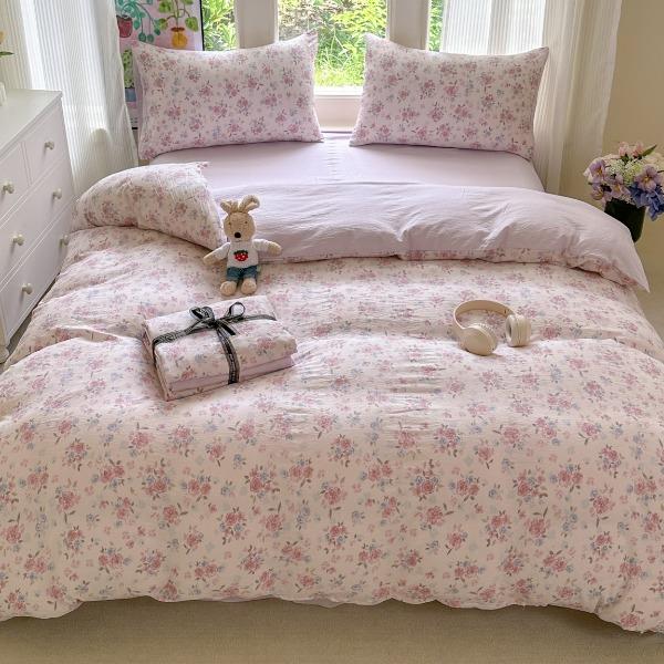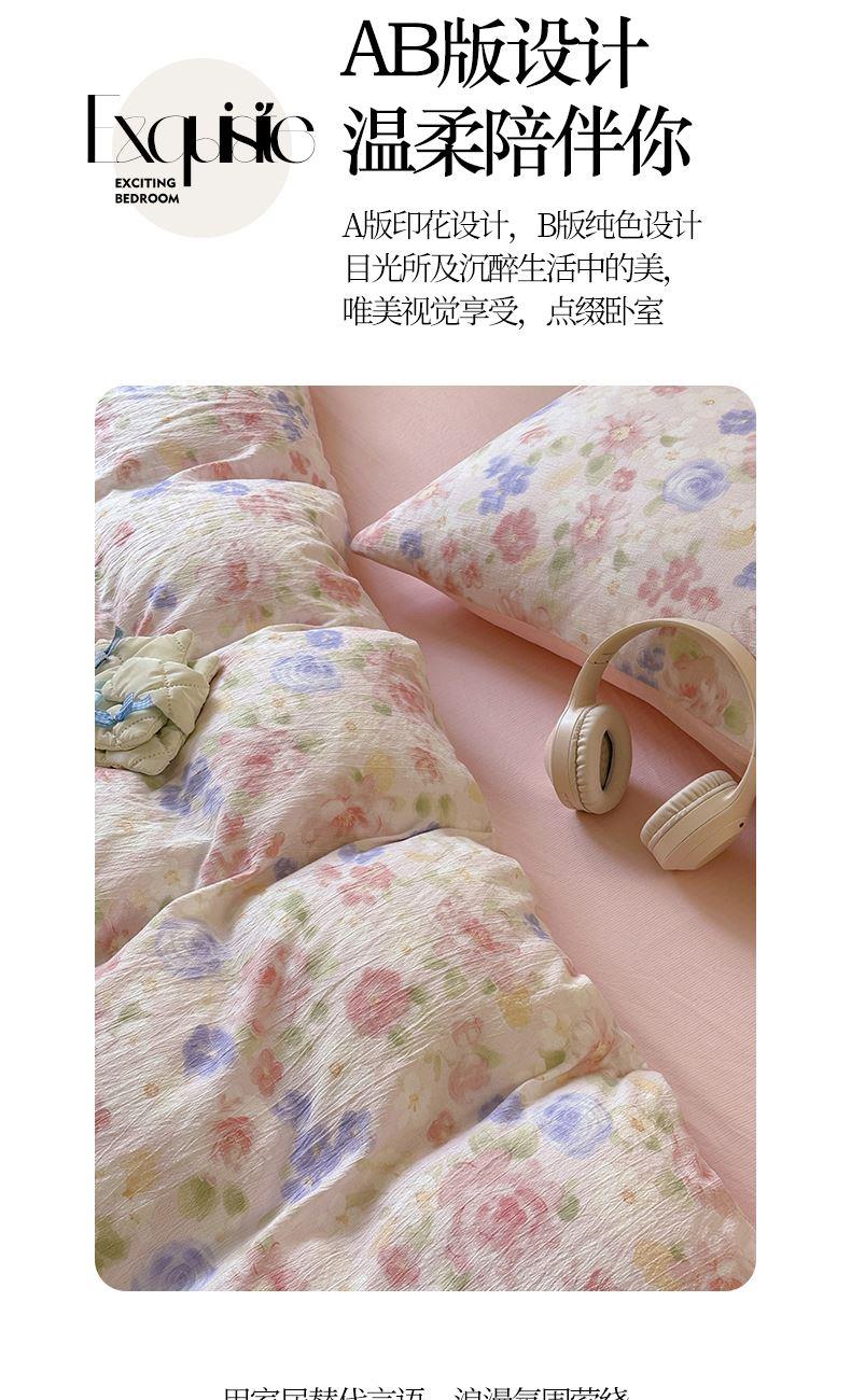 1:邂逅柔软水洗棉面料 触感柔软细腻云感舒适 感知好睡眠 感受每一次接触带来的柔软体验 2:水洗双层纱触感柔软亲肤看得见的透气性 3:A版印花设计,B版纯色设计目光所及沉醉生活中的美。唯美视觉享受,点缀卧室 尺寸:被套200*230cm*1 床单:240*245cm*1 枕套:48*74cm*2 包装:彩盒