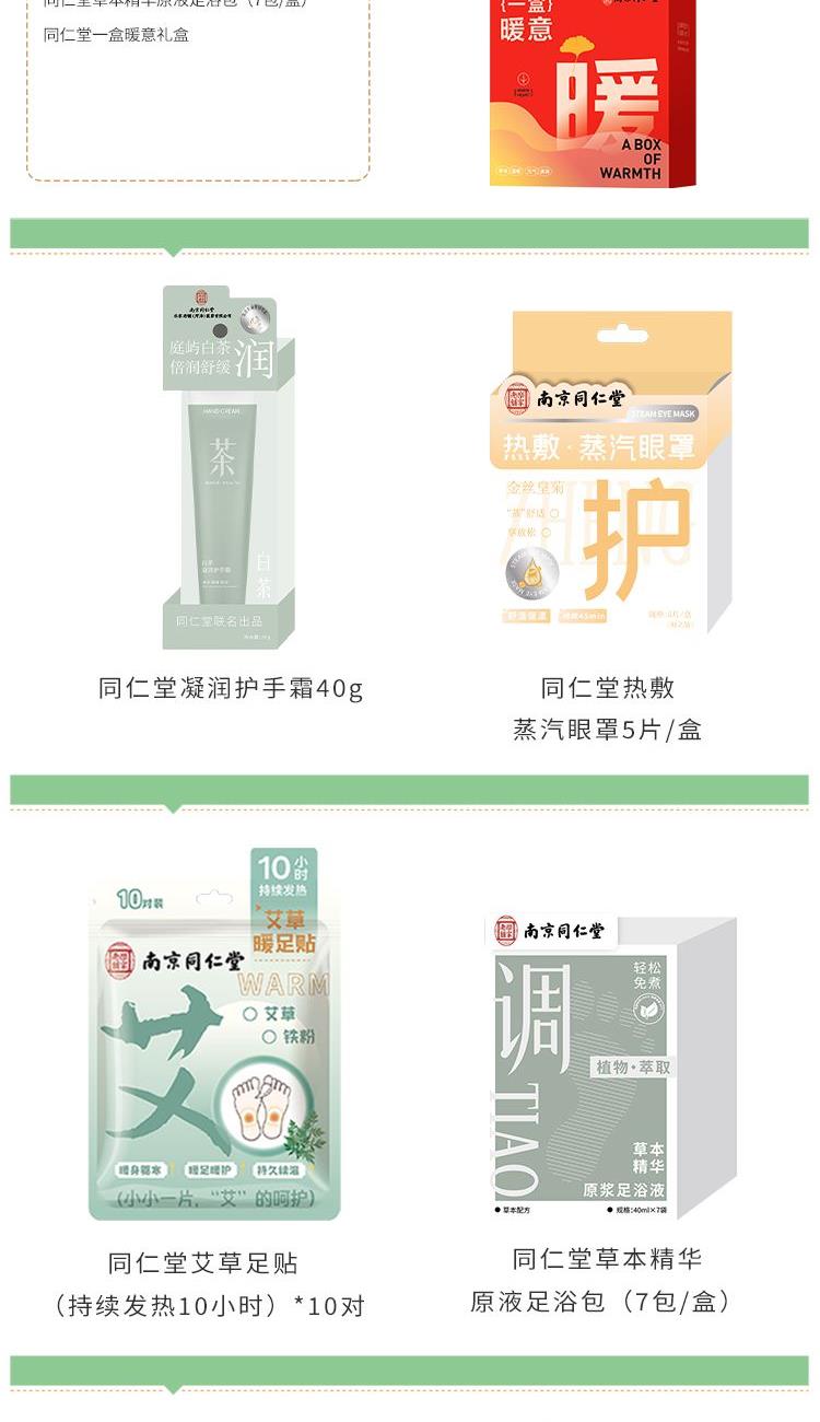 同仁堂艾草暖身贴(持续发热12小时)*10贴 同仁堂艾草足贴(持续发热10小时)*10对 同仁堂凝润护手霜40g 同仁堂热敷蒸汽眼罩5片/盒 同仁堂草本精华原液足浴包(7包/盒) 思珀莱一盒暖意礼盒