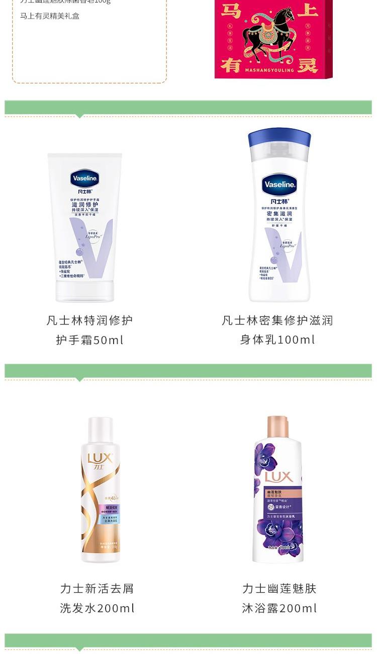 凡士林密集修护滋润身体乳100ml 凡士林特润修护护手霜50ml 力士新活去屑洗发水200ml 力士幽莲魅肤沐浴露200ml 力士幽莲魅肤香皂100g 马上有灵精美礼盒