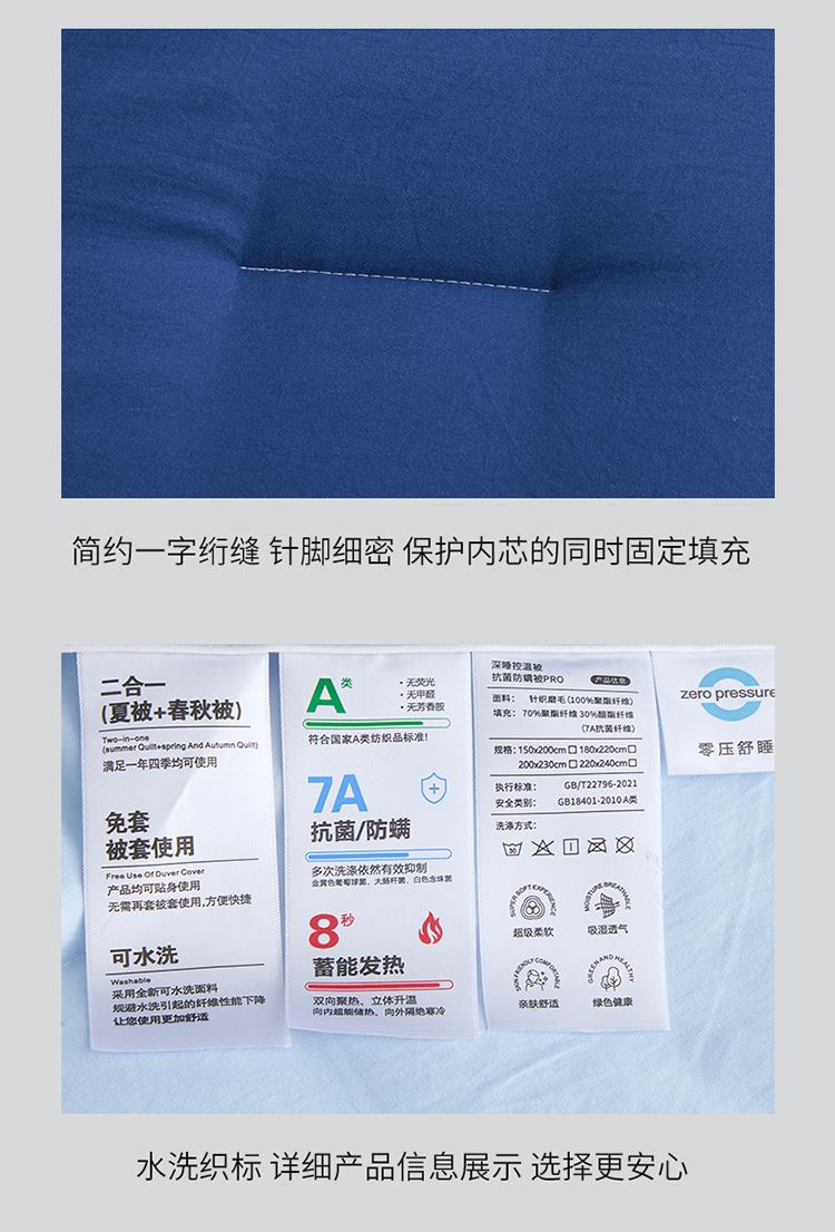 1:感裸肌针织面料睡感提升 像贴身衣物一样柔软留出空气通道 透气加倍 无潮湿无闷热 2:不怕温差波动 整张醋酸复合填充让内芯配合温控 盖上 身体就陷入软糯里 免被套加持 可直接机洗打理 尺寸:200*230cm 重量:3kg 包装:无纺布礼袋