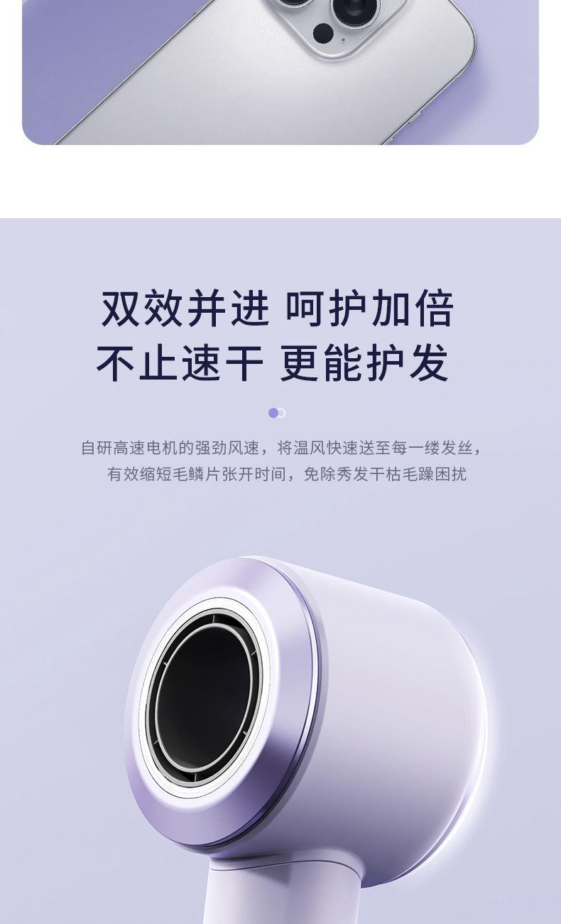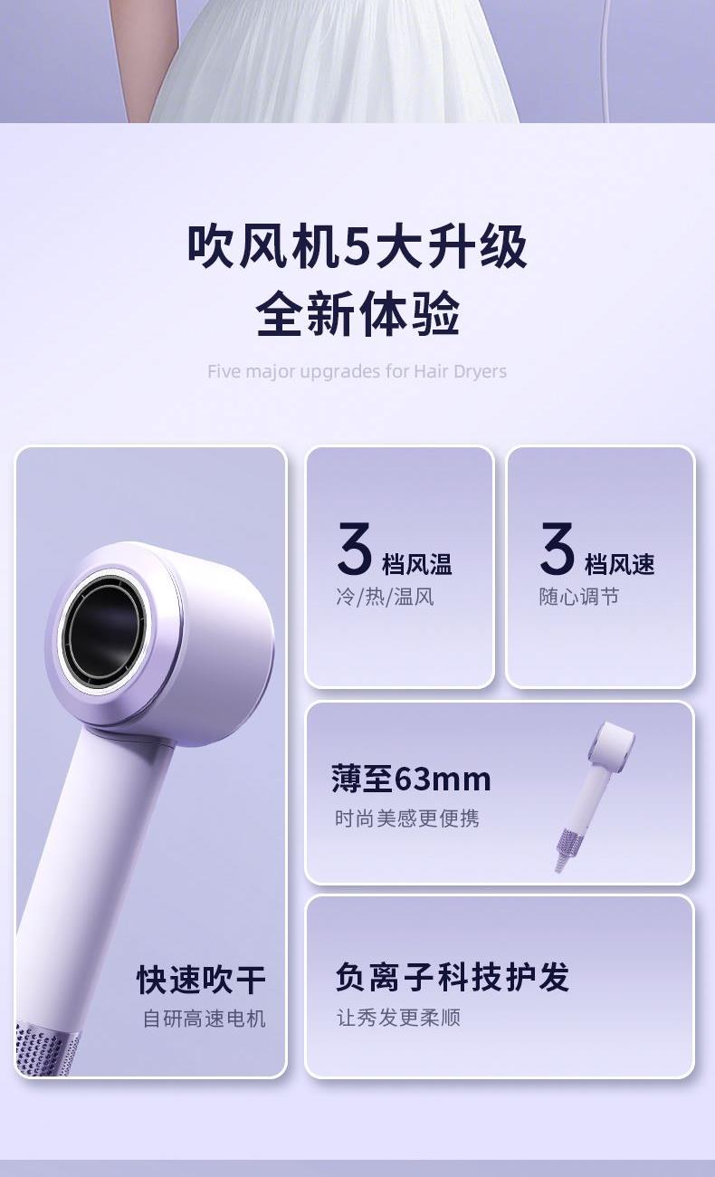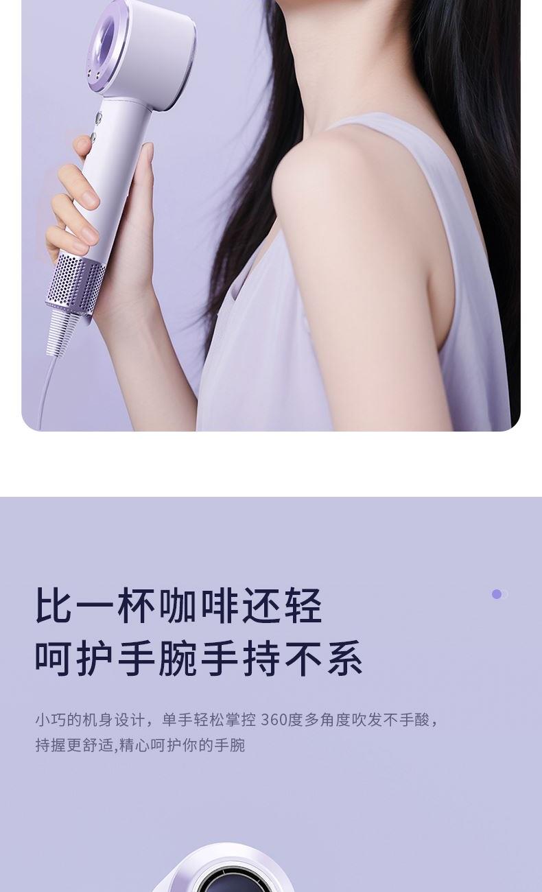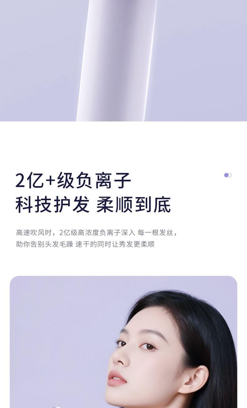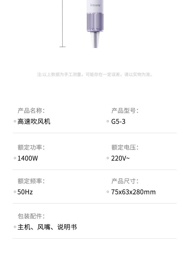 产品型号:G5-3 输入电压:220V 额定功率:1400W 电机转数:11万转 负离子量: 2亿 产品尺寸:280*75*63mm 礼盒尺寸:350*150*95mm 单台毛重:1.1kg 1、高效吹干 轻巧便携 多重降噪 2、配置11万转/分钟的自研高速电机,能够高效快速 3、吹干头发的同时不易打结,早晚洗发无负担 4、自研高速电机的强劲风速,将温风快速送至每一缕发丝 5、2亿+级负离子科技护发 柔顺到底 6、小巧的机身设计,单手轻松掌控 360度多角度吹发不手酸