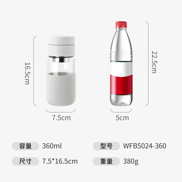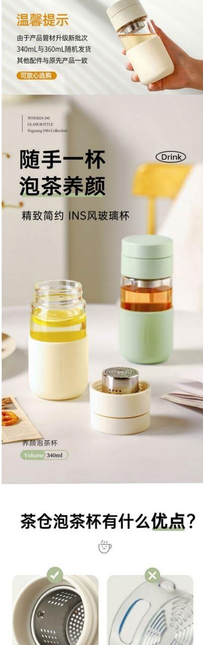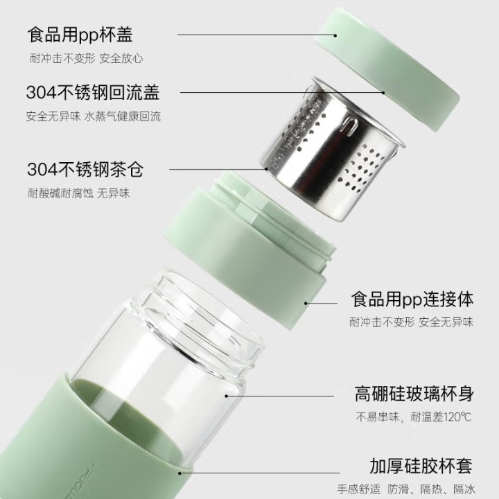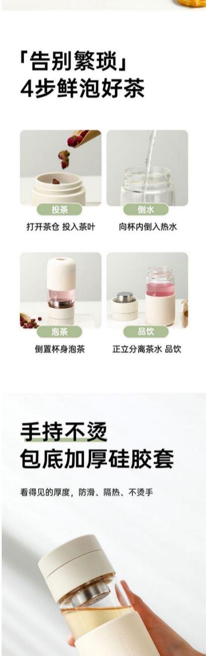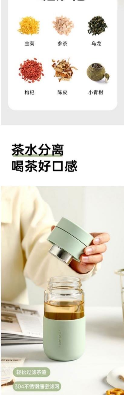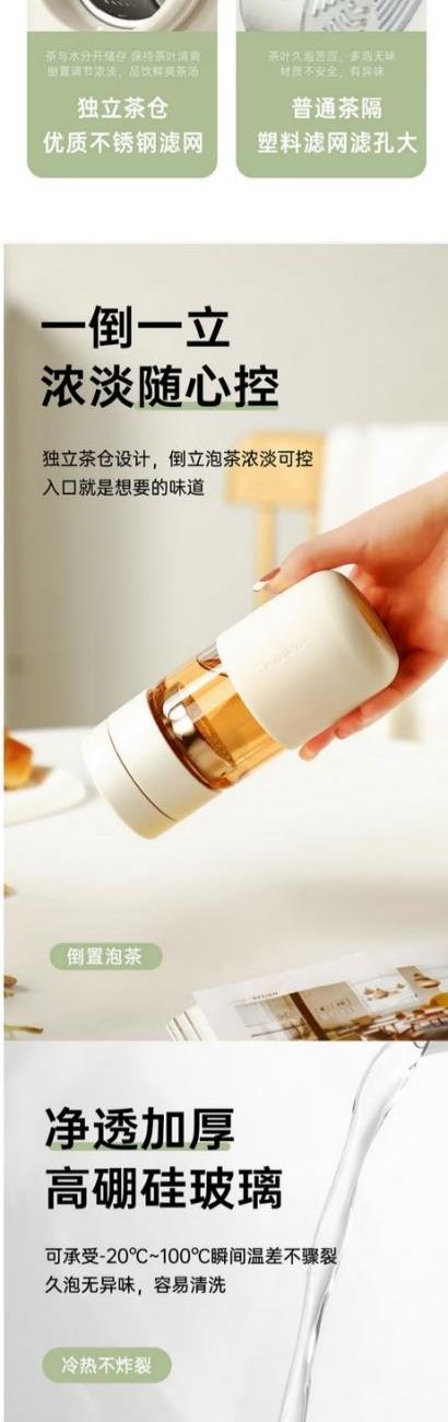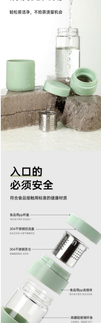容量:360ml 重量:380g 颜色:绿色 粉色 白色 紫色 尺寸:75*165mm 材质:高硼硅玻璃材质,杯身硅胶垫,防烫不易碎。 304不锈钢加长滤网,独有泡茶方式,倒置泡茶开盖品饮。杯盖304不锈钢回流盖。 包装:单瓦盒