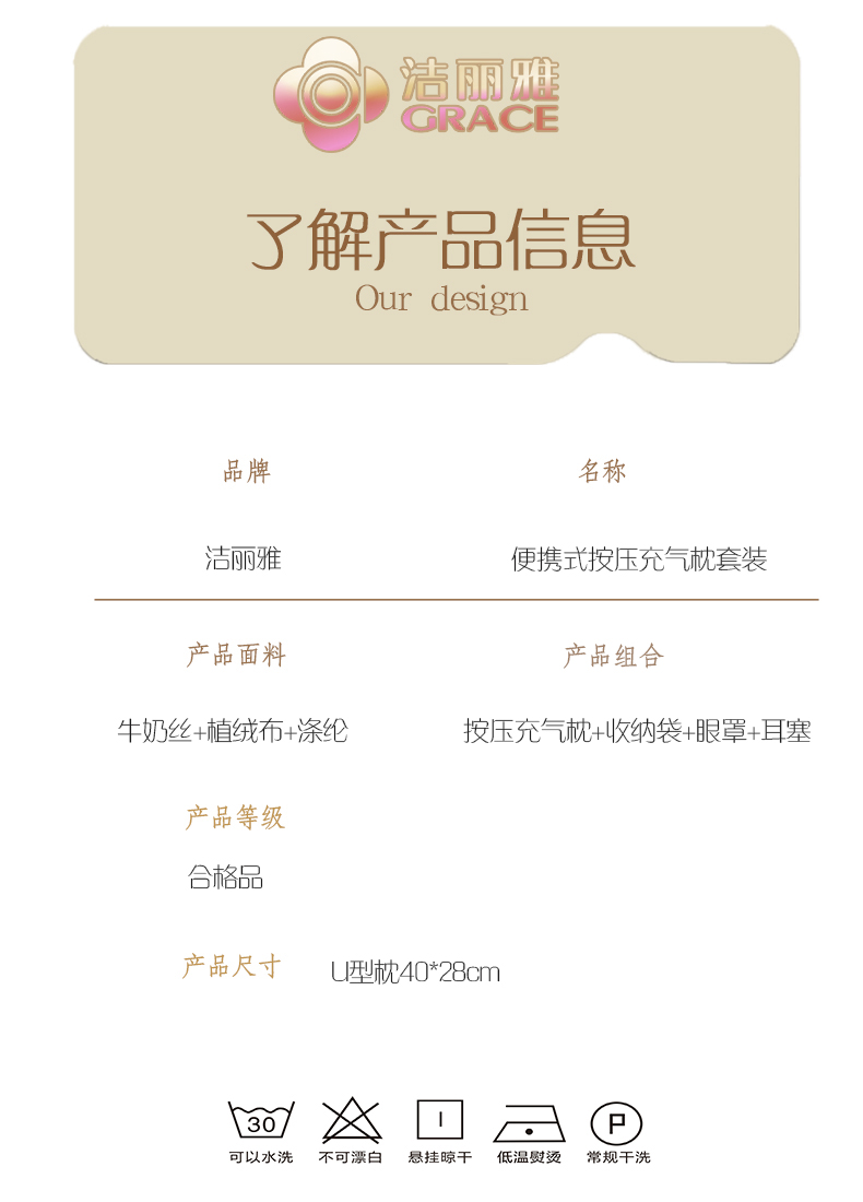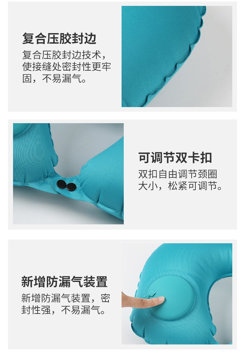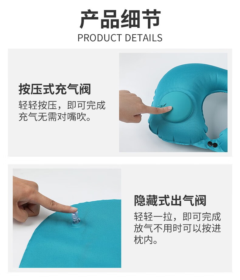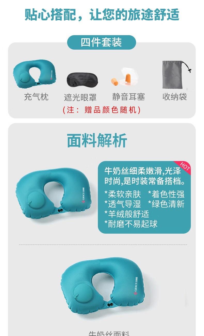 组合:按压充气枕+收纳袋+眼罩+耳塞 面料:牛奶丝+植绒布+涤纶 尺寸:U型枕40*28cm 执行标准:GB/T22796-2021 安全类别:GB18401-2010 B类 采便携充气护颈枕,收纳便捷,差旅好伴