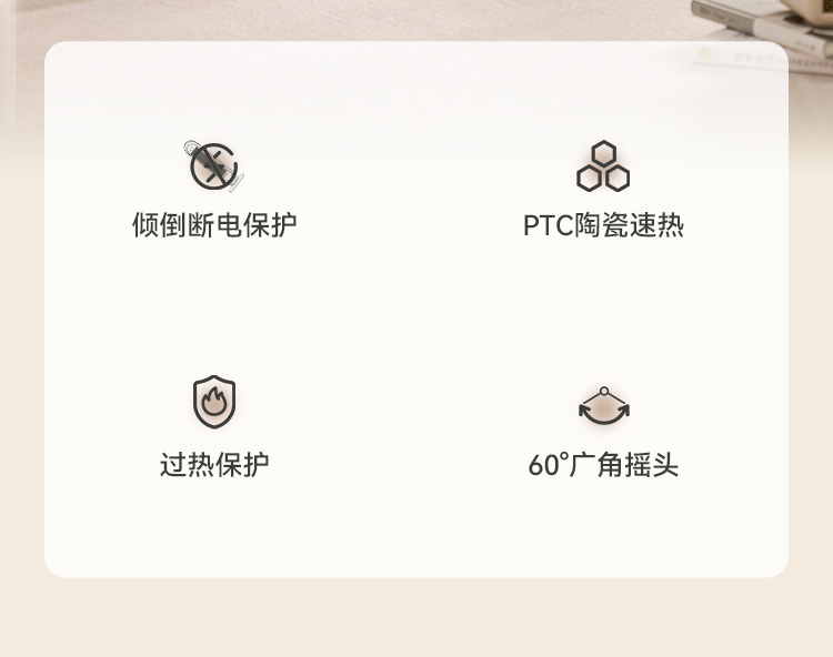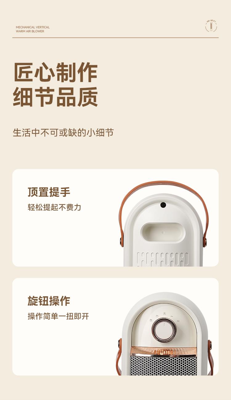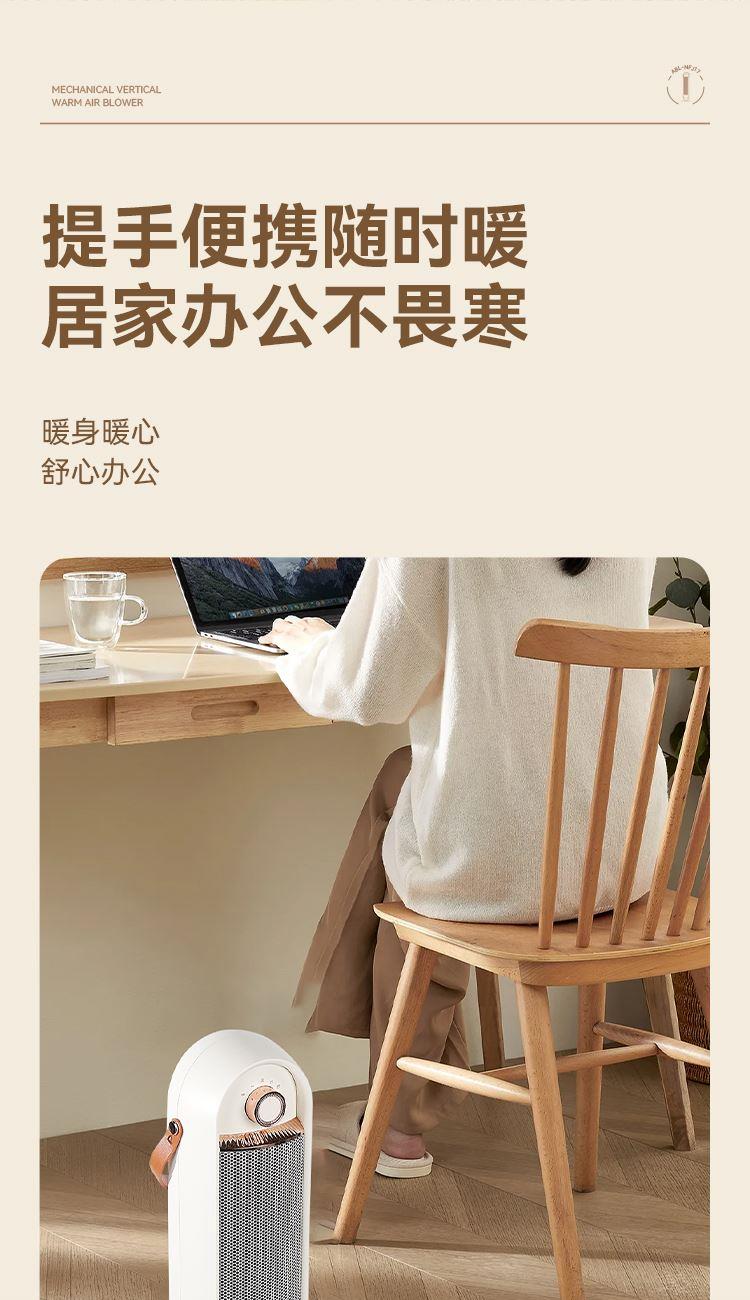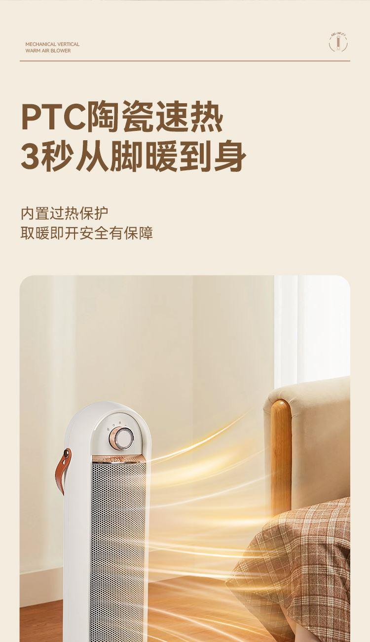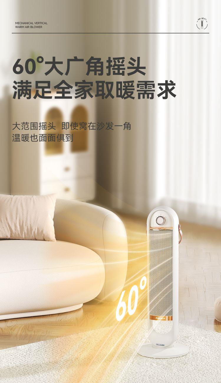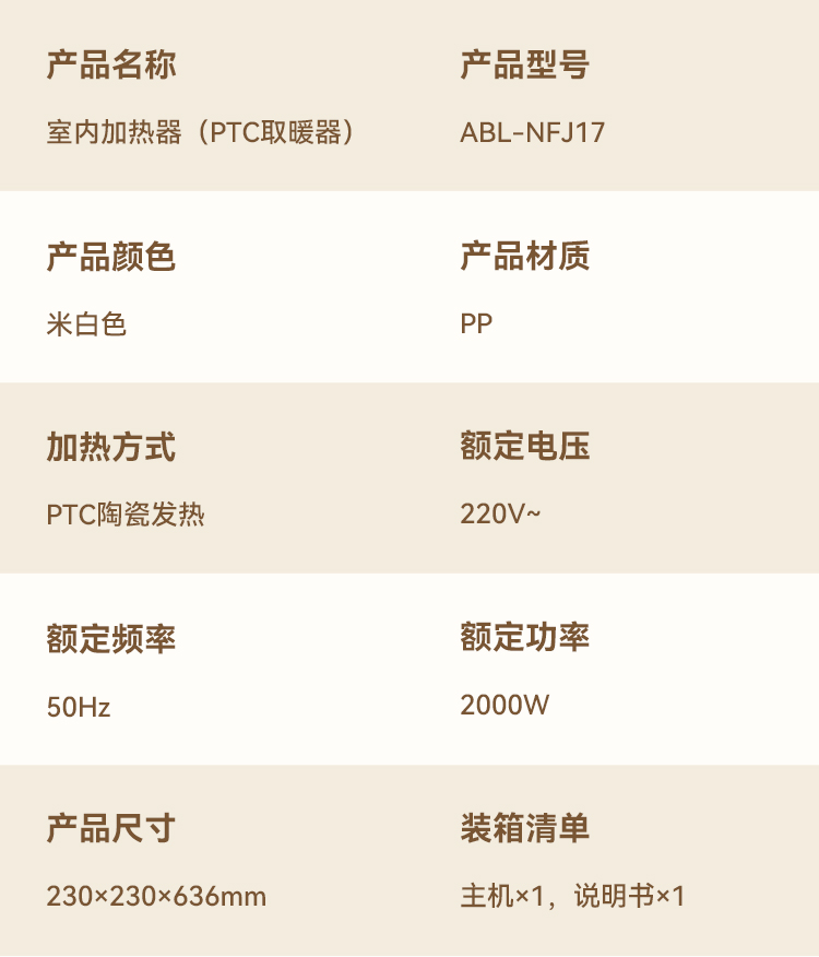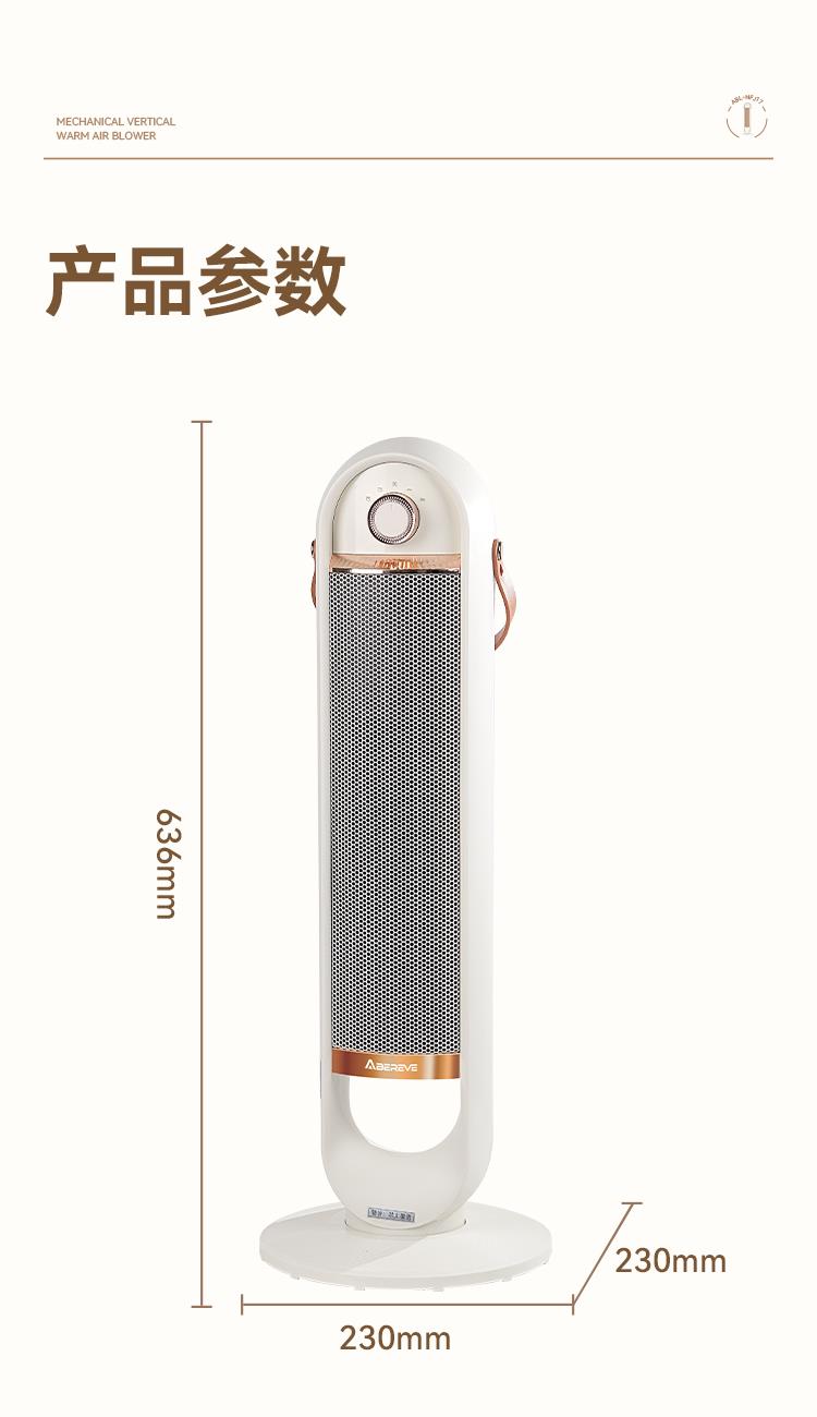 产品颜色:米白色 加热方式:石墨烯PTC陶瓷发热 额定电压:220V~ 额定频率:50Hz 摇头角度:60° 档位/功率:两档调节 产品净重:1.75kg 产品毛重:2.32kg 产品尺寸:230*230*636mm 包装尺寸:200*155*685mm ◁ 石墨烯速热科技,冬日取暖不等待 ◁ 倾倒断电保护,家有宠物、孩童也能放心使用 ◁内置过热保护,安心享受恒温暖风 ◁12V直流暖风机,安全节能,强劲静享 ◁ 60°大广角摇头,满足大空间多人取暖需求