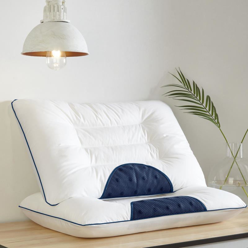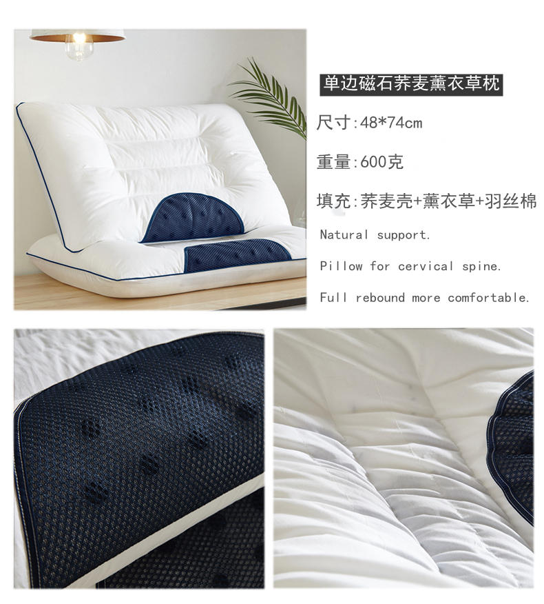 规格:48*74cm 重量:600克 面料:聚酯纤维 填充:荞麦壳+薰衣草+羽丝棉 高支高密面料,舒适透气,柔软服帖,超细羽丝绒纤维和中间添加荞麦壳、薰衣草合理填充,让人可以更轻松入眠,磁石按摩颈部,助眠安神,饱满舒适,回弹力好,满足睡眠需求,精致锁边工艺,耐用不跑棉。定型护颈设计,更贴合颈椎。