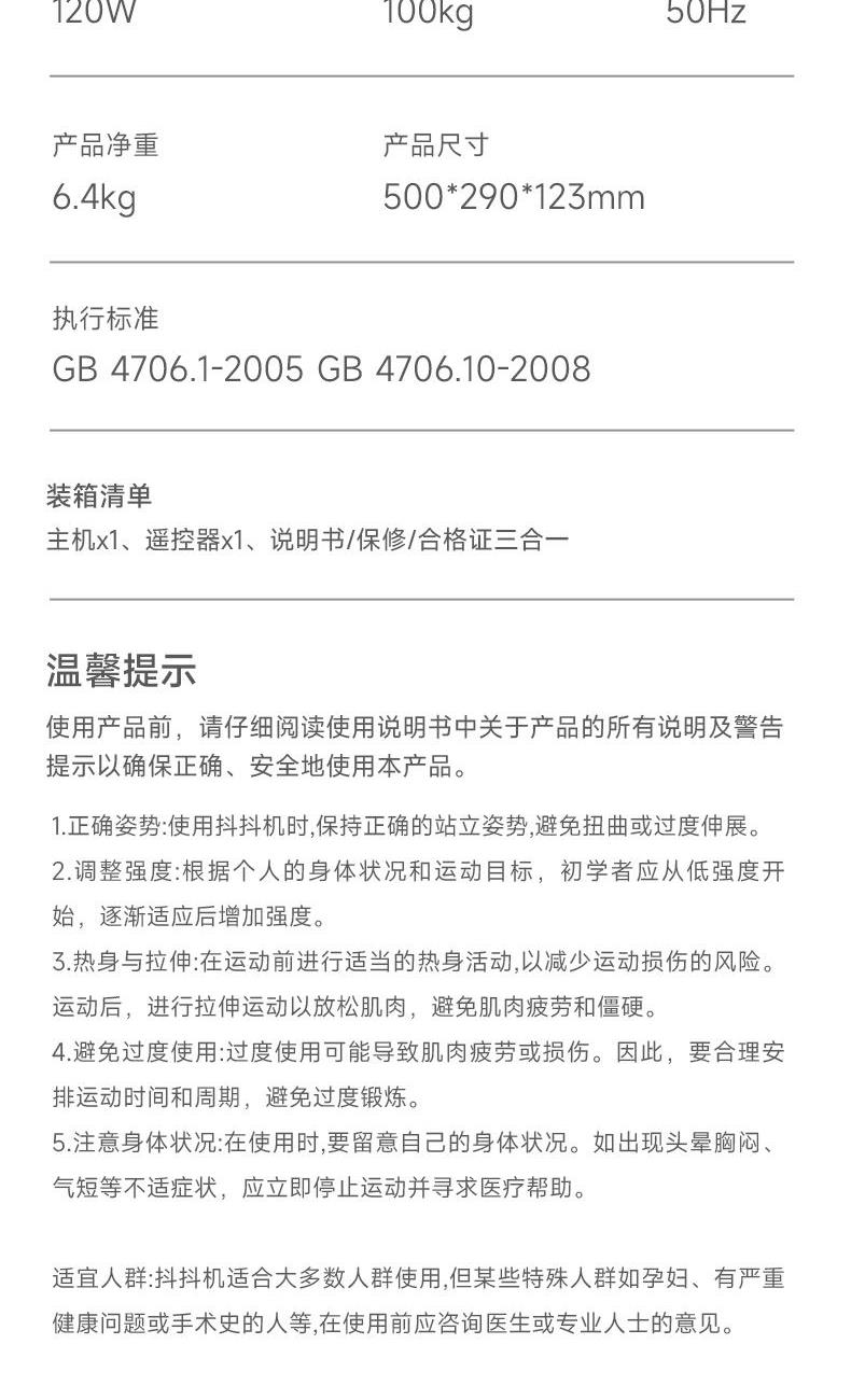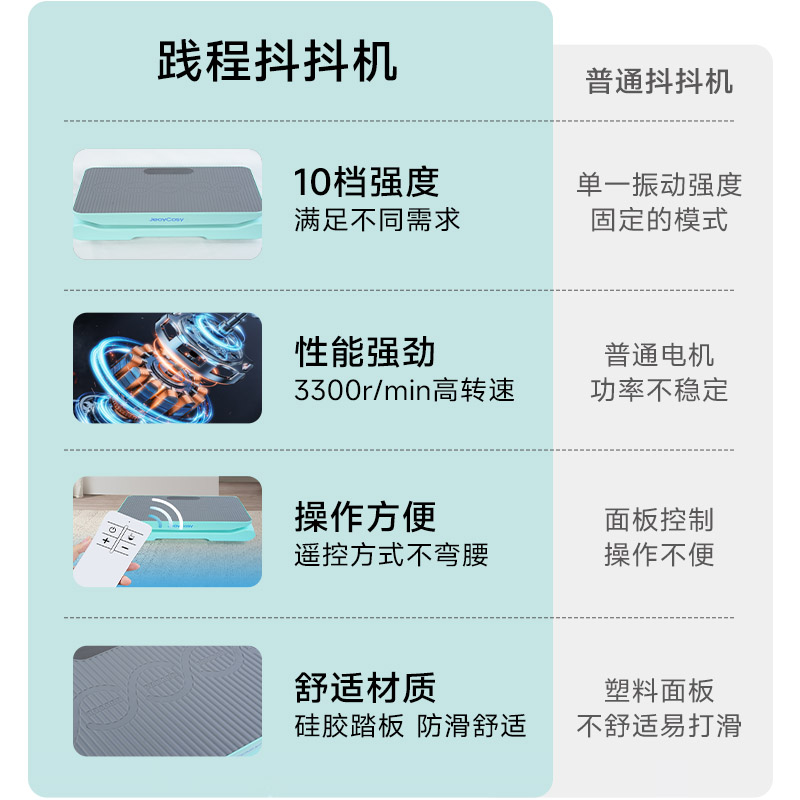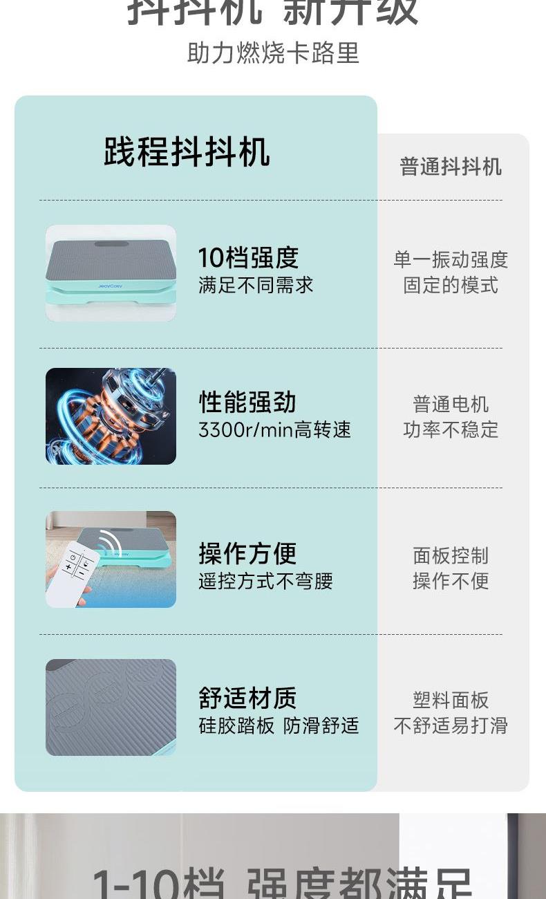 1、10档科学变频,满足对力度的畅享 2、智能无线遥控,启动更简单,档位、模式轻松调节 3、升级加强大电机,抖动力度更大,效果更强 4、悠闲健身,足不出户,燃脂健身 5、底部吸盘设计稳固不滑动,尽情运动不用担心机器会移位