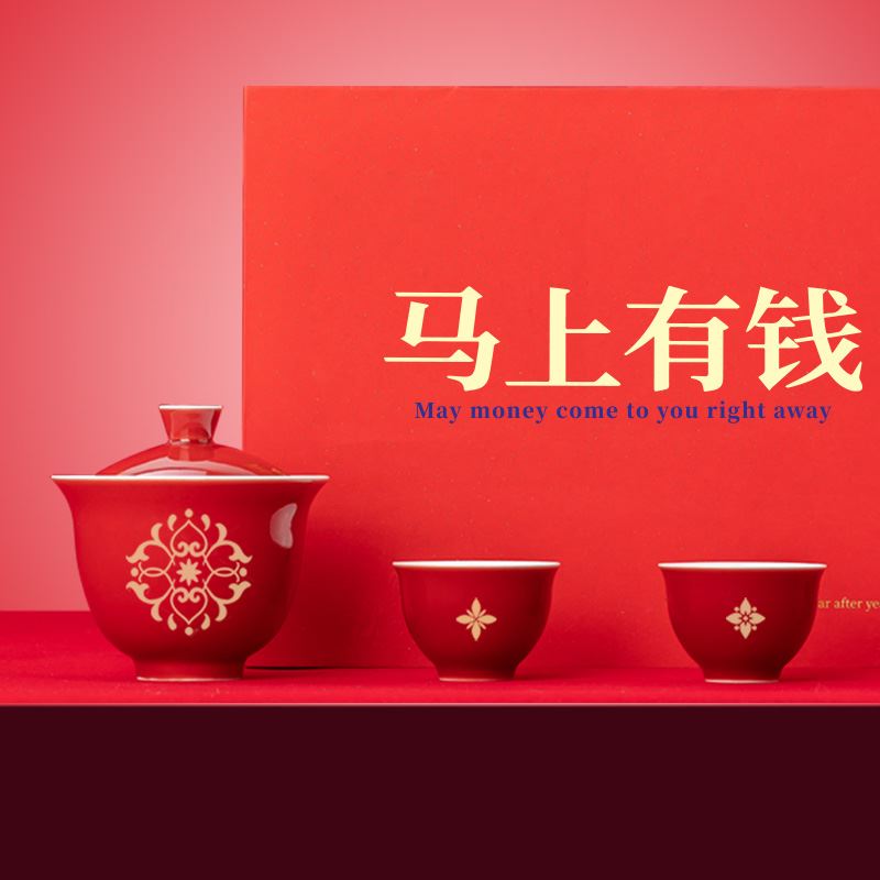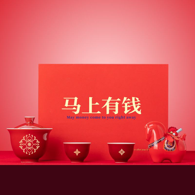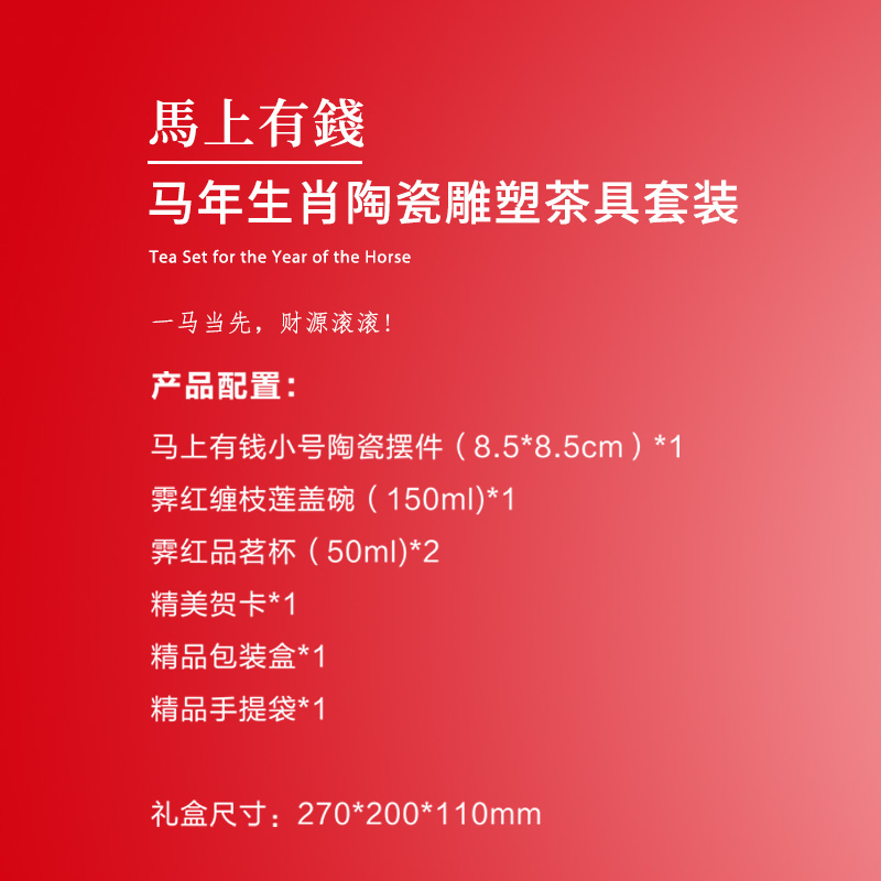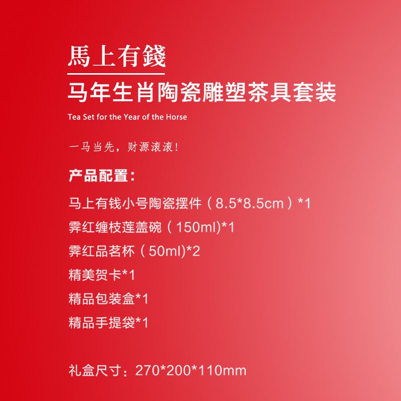 【产品配置】 马上有钱小号陶瓷摆件(8.5*8.5cm)*1 霁红缠枝莲盖碗(150ml)*1 霁红品茗杯(50ml)*2 精美贺卡*1 精品包装盒*1 精品手提袋*1 【产品说明】 马年生肖主题,“马上有钱”寓意招财,贺岁送礼佳选; 茶具+马摆件组合,品茶赏玩一器多能; 霁红缠枝莲纹饰,传统工艺有质感; 茶具+摆件+贺卡,礼品配置丰富又贴心; 马年开门红礼品,商务亲友馈赠心意之选。