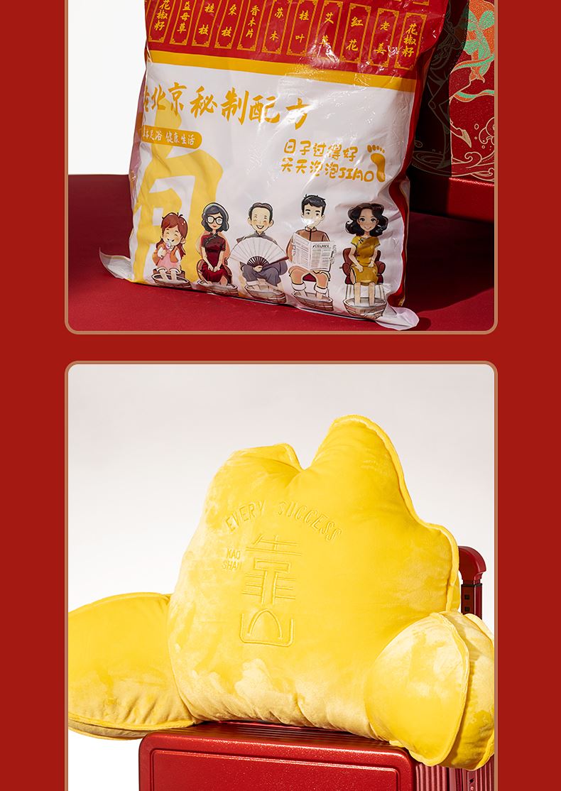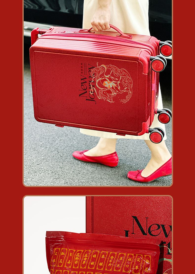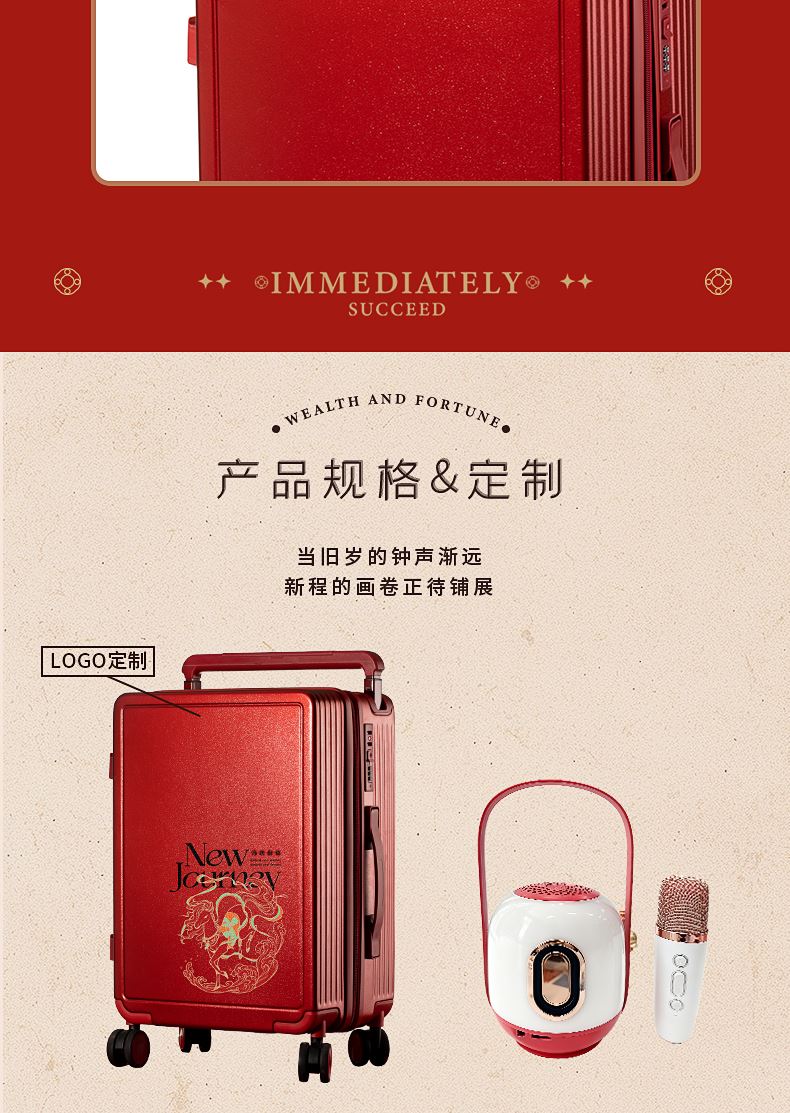 产品配置:20寸行李箱、多功能蓝牙音响加氛围灯加唛、靠山腰枕、十八味药材泡脚包30袋、马年大吉红包*6个