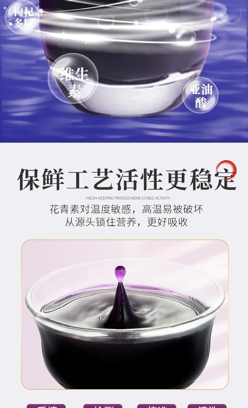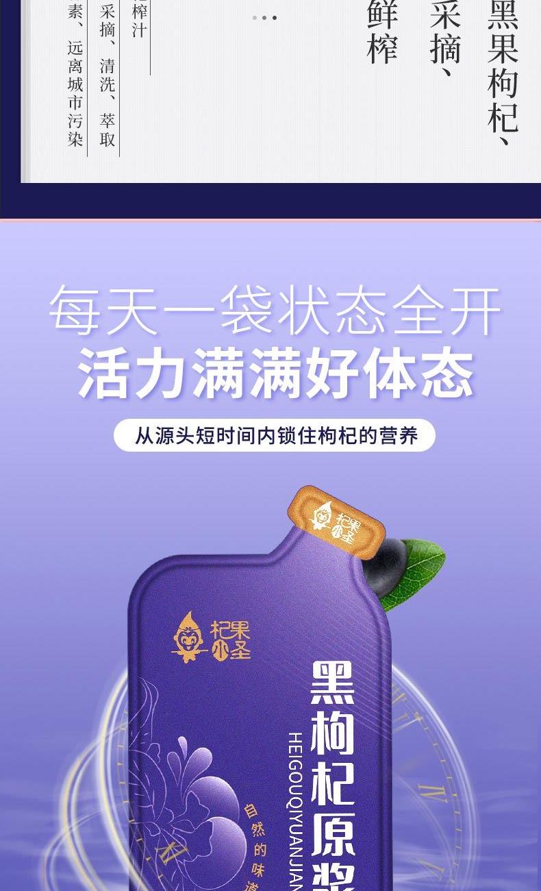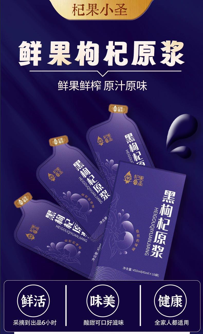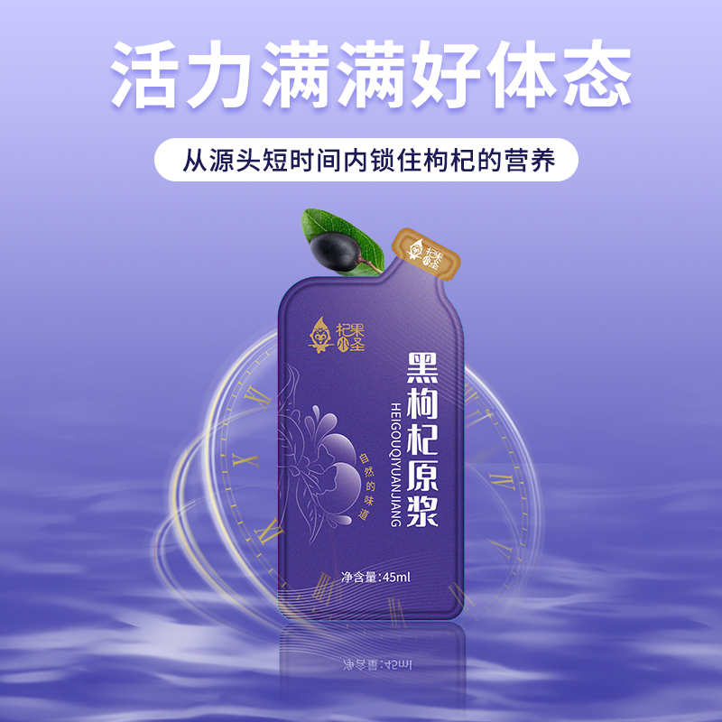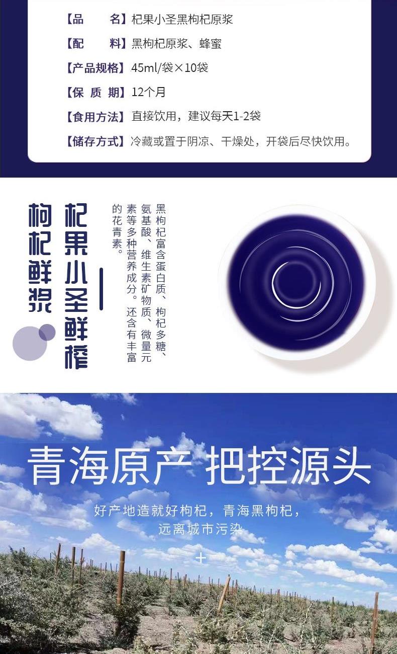 【 配 料 】 青海黑果枸杞汁 【 产 地 】 宁夏·中宁 【 保 质 期 】 18 个 月 【 规 格 】45ml*10袋/盒 【优 势】 原料来自世界四大人间净土之一的青海格尔木的黑枸杞,养分足、温差大、日照强、海拔高、土壤肥、雪水灌溉。富含原花青素,醇香绵密,酸甜适口。采用低温物理破壁技术,1.5小时成浆,液态小分子,营养易于吸收。