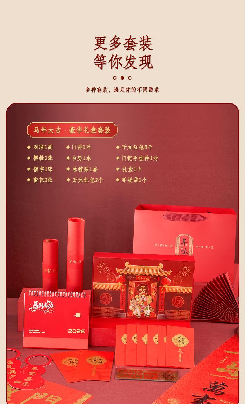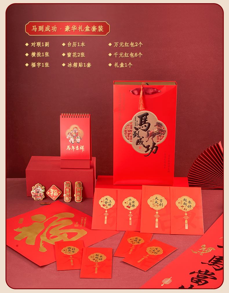 1.注:商城报价对应首张主图款式! 其他套装参考细节图,费用另计! 2. 咨询下单请备注好产品信息! 3.首图款式产品明细:贺新年特种纸对联套装: 对联1副、横批1张、福字1张、窗花2张、台历1本、冰箱贴1套、万元红包2个、千元红包6个、礼盒1个
