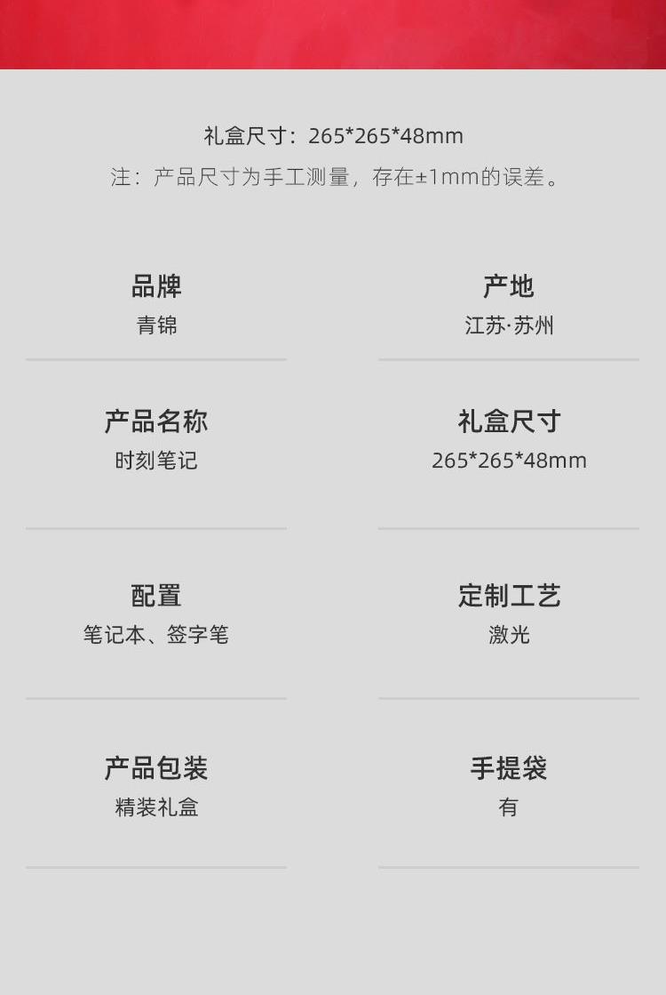 配置 优盘笔记本x1 颜色:黑色 磁吸优盘*1 内存:64GB 签字笔*1 包装:礼盒 材质 皮革(肤感皮革) 千越象牙白纸100克80张 定制工艺:激光 镭射 尺寸 笔记本:175*230mm 礼盒尺寸:268*268mm