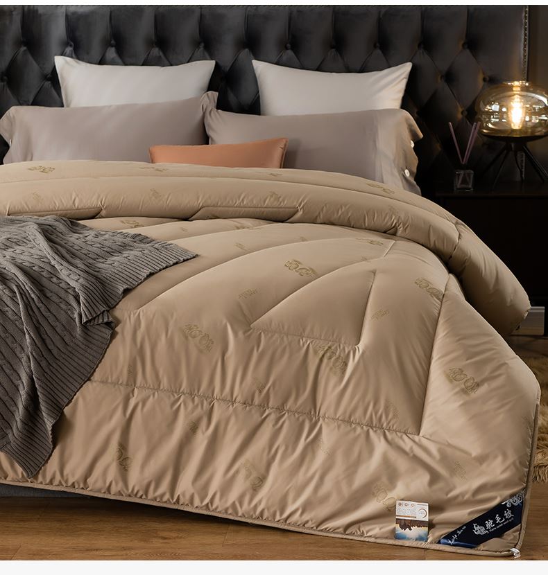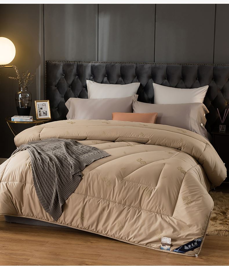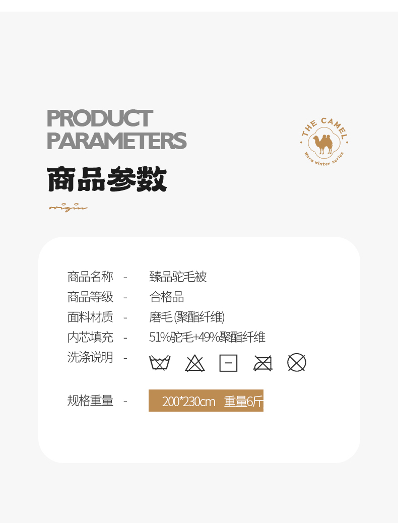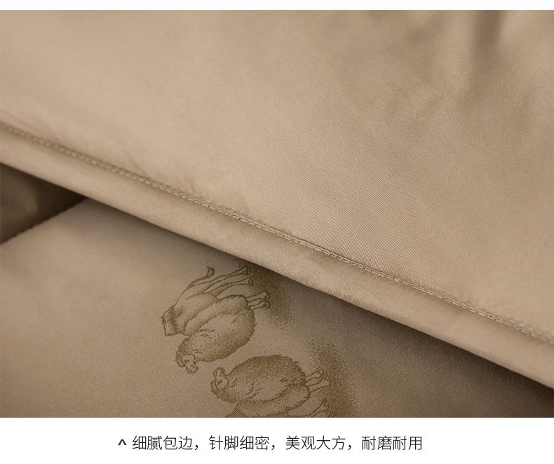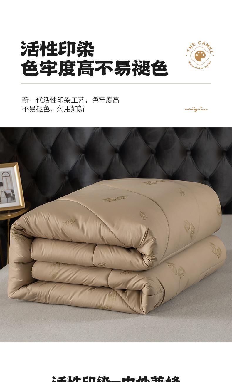 面料:防羽布(聚酯纤维) 规格:200×230cm 填充:51%驼毛+49%聚酯纤维 总重:3000g 包装:精美软包 臻品驼毛被,加厚保暖·柔软蓬松·透气恒温黄金比例,蓬松柔软的混纺技术,创新超细纤维与优质驼毛混纺,51%优质驼毛配比49%聚酯纤维让驼毛被贴身又保暖。
