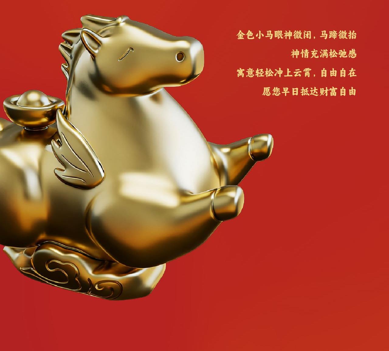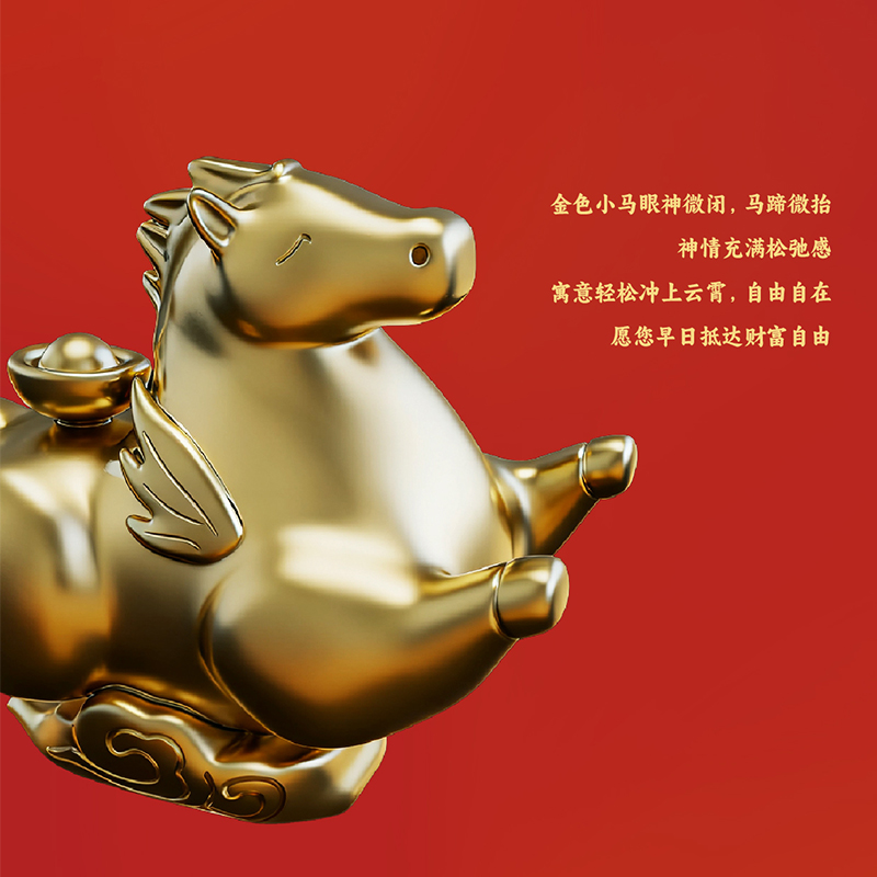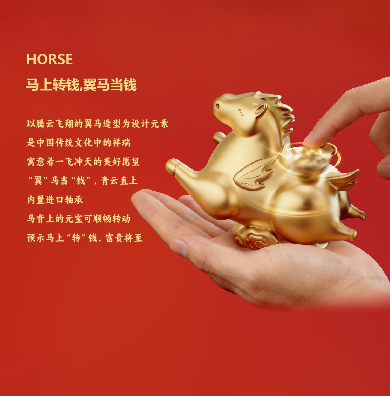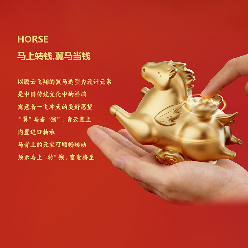 以腾云飞翔的翼马造型为设计元素 是中国传统文化中的祥瑞 寓意着一飞冲天的美好愿望 “翼”马当“钱”,青云直上 内置进口轴承 马背上的元宝可以顺畅转动 预示马上“转”钱,富贵将至 云底凹刻精美印章 携手书法家黄陵野鹤 以“发财”为主题 寄托美好意愿,新国潮 金色小马眼神微闭,马蹄微抬 神情充满松弛感 寓意轻松冲上云霄,自由自在 愿您早日抵达财富自由 摆件尺寸: 76x65x45mm 包装尺寸: 99x88x70mm