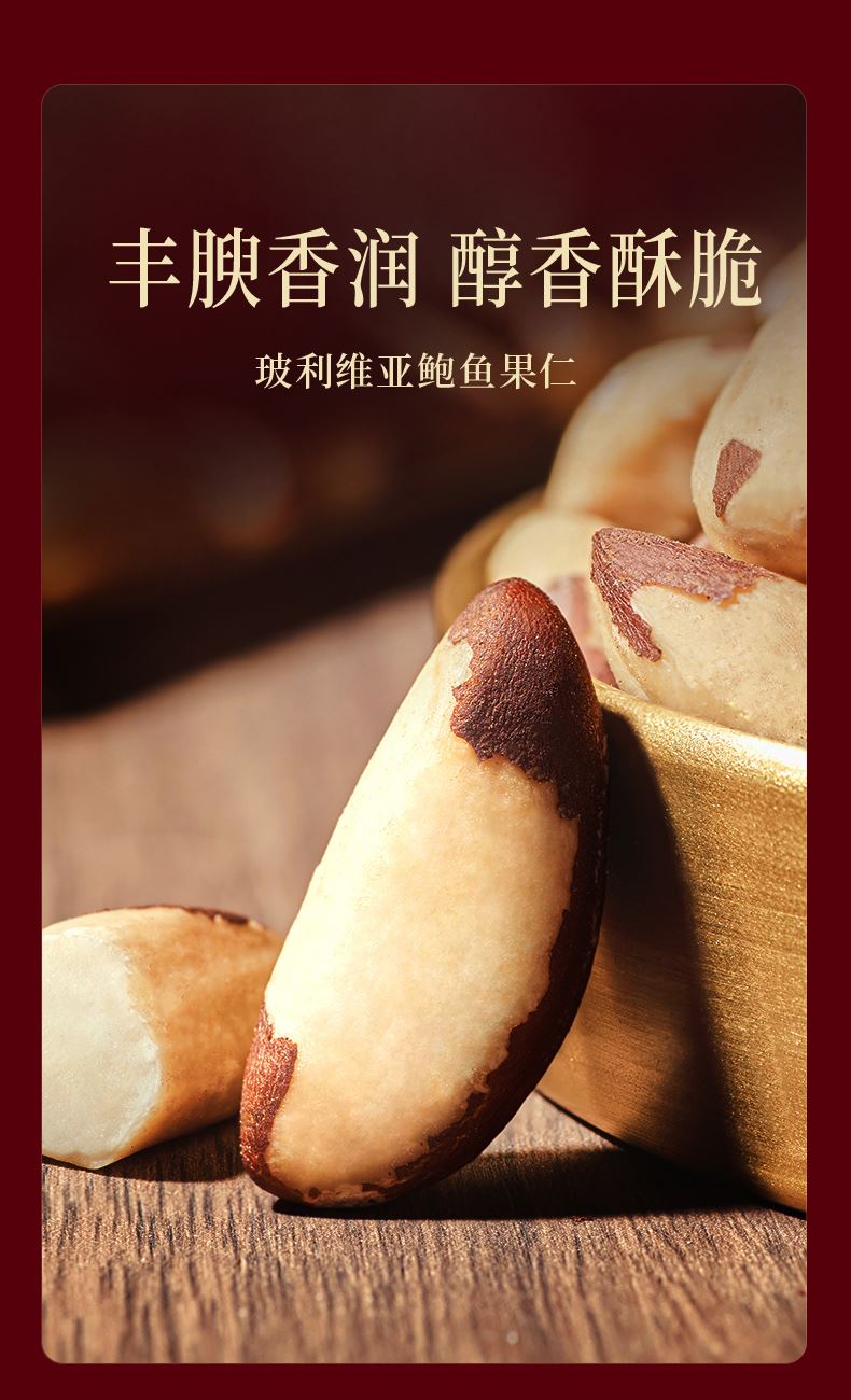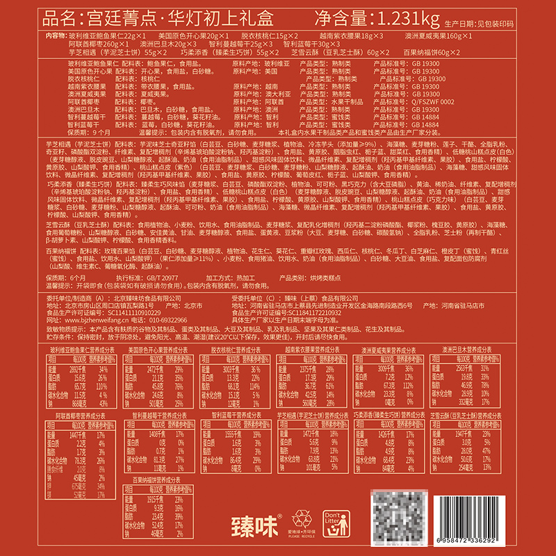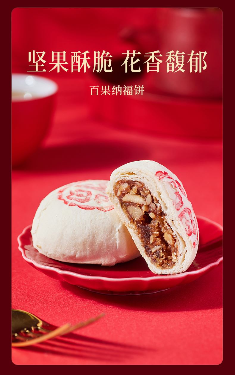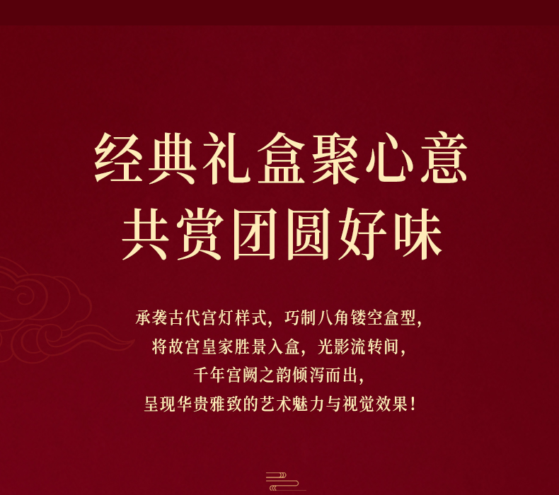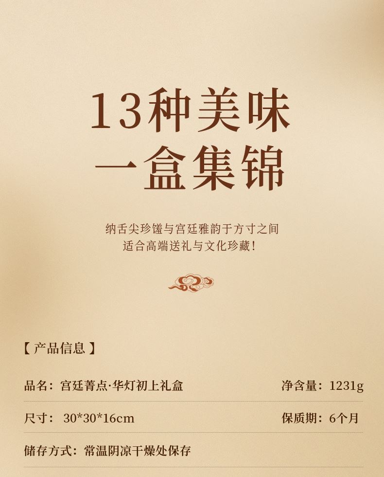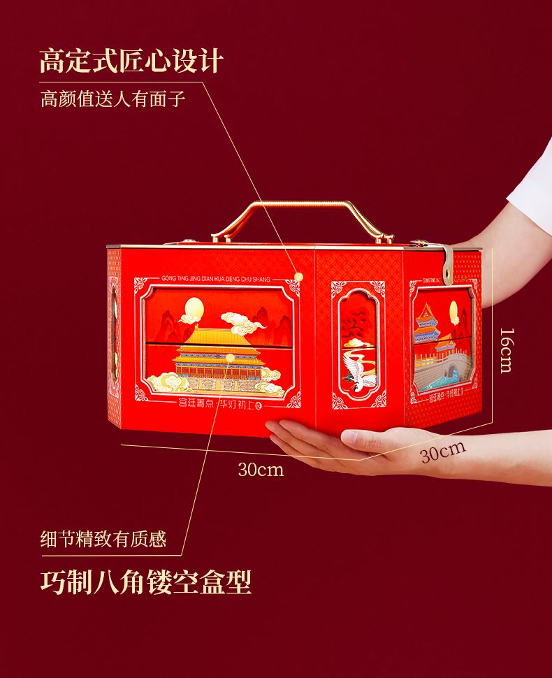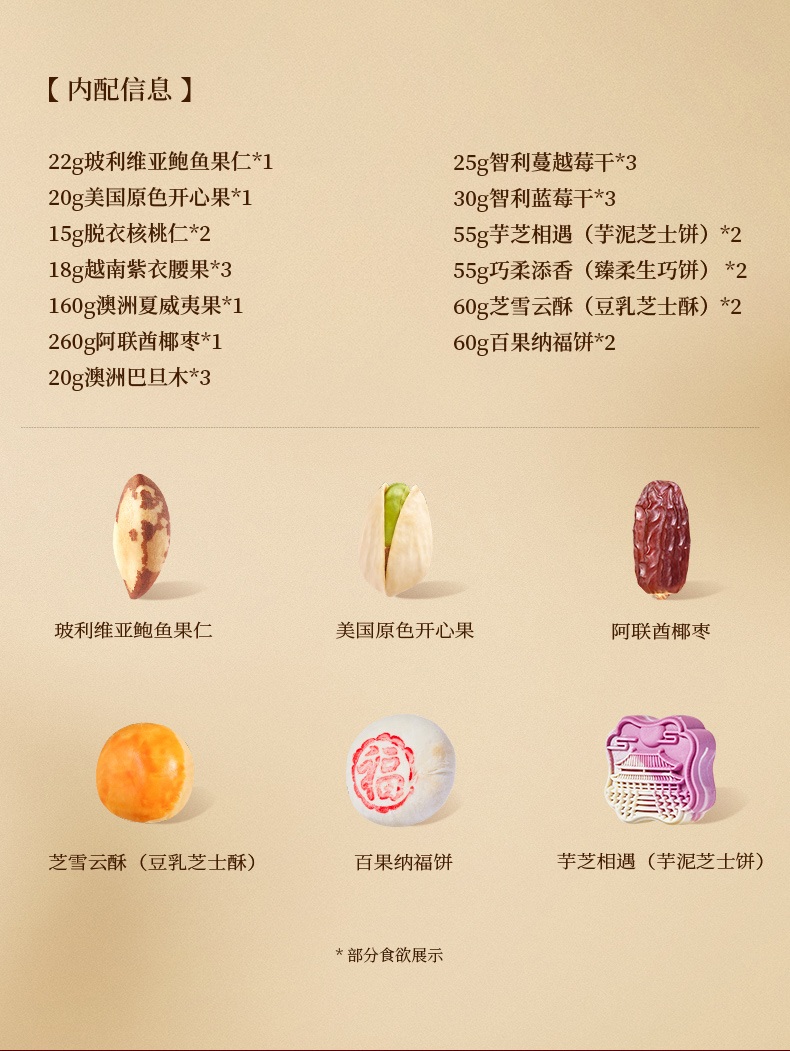 22g玻利维亚鲍鱼果仁*1 20g美国原色开心果*1 15g脱衣核桃仁*2 18g越南紫衣腰果*3 160g澳洲夏威夷果*1 260g阿联酋椰枣*1 20g澳洲巴旦木*3 25g智利蔓越莓干*3 30g智利蓝莓干*3 55g芋芝相遇(芋泥芝士饼)*2 55g啡韵添香(炭烧咖啡饼)*2 60g芝雪云酥(豆乳芝士酥)*2 60g百果纳福饼*2 承袭古代宫灯样式,巧制八角镂空盒型,将故宫皇家胜景入盒,光影流转间,千年宫阙之韵倾泻而出,呈现华贵雅致的艺术魅力与视觉效果;净含量:1231g,内含6种坚果,3种果干,4款糕点,赏故宫风华,与美味共赴团圆!